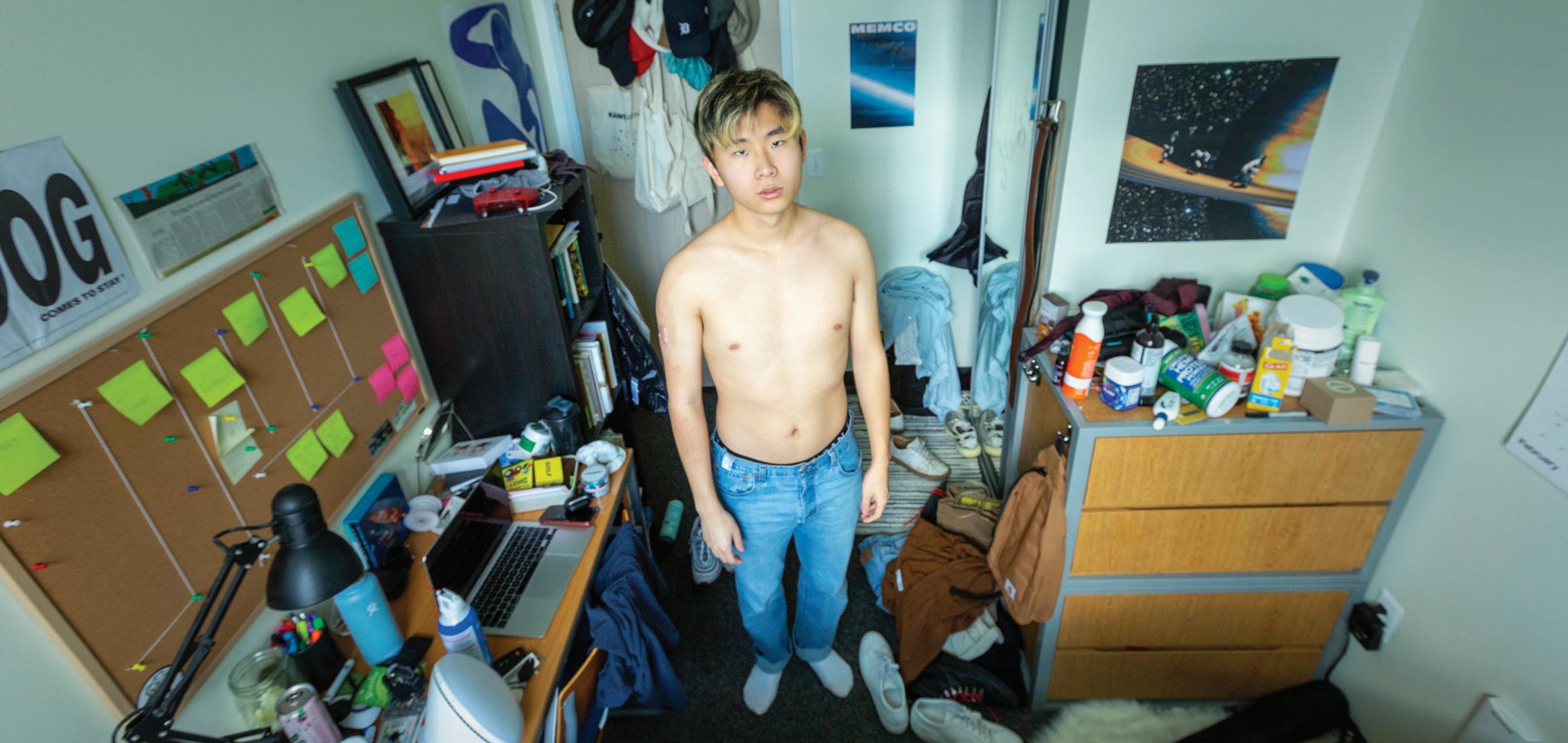 The first space of the “home” is the kitchen, which includes homelike details ranging from a cereal box resting on top of the refrigerator