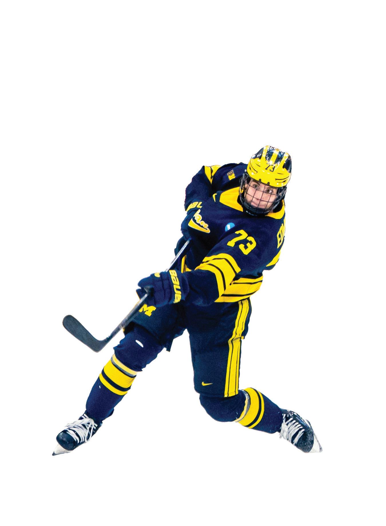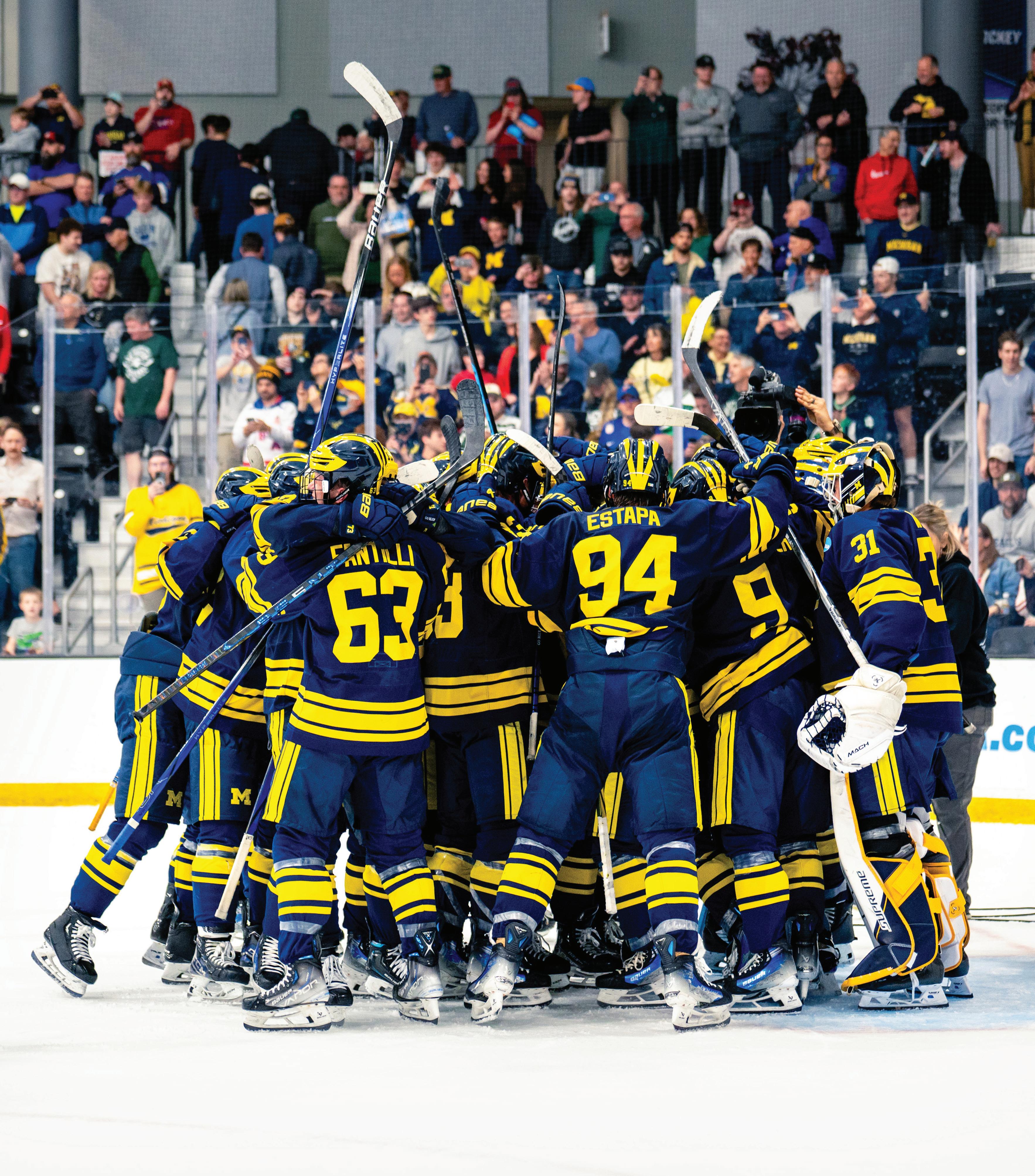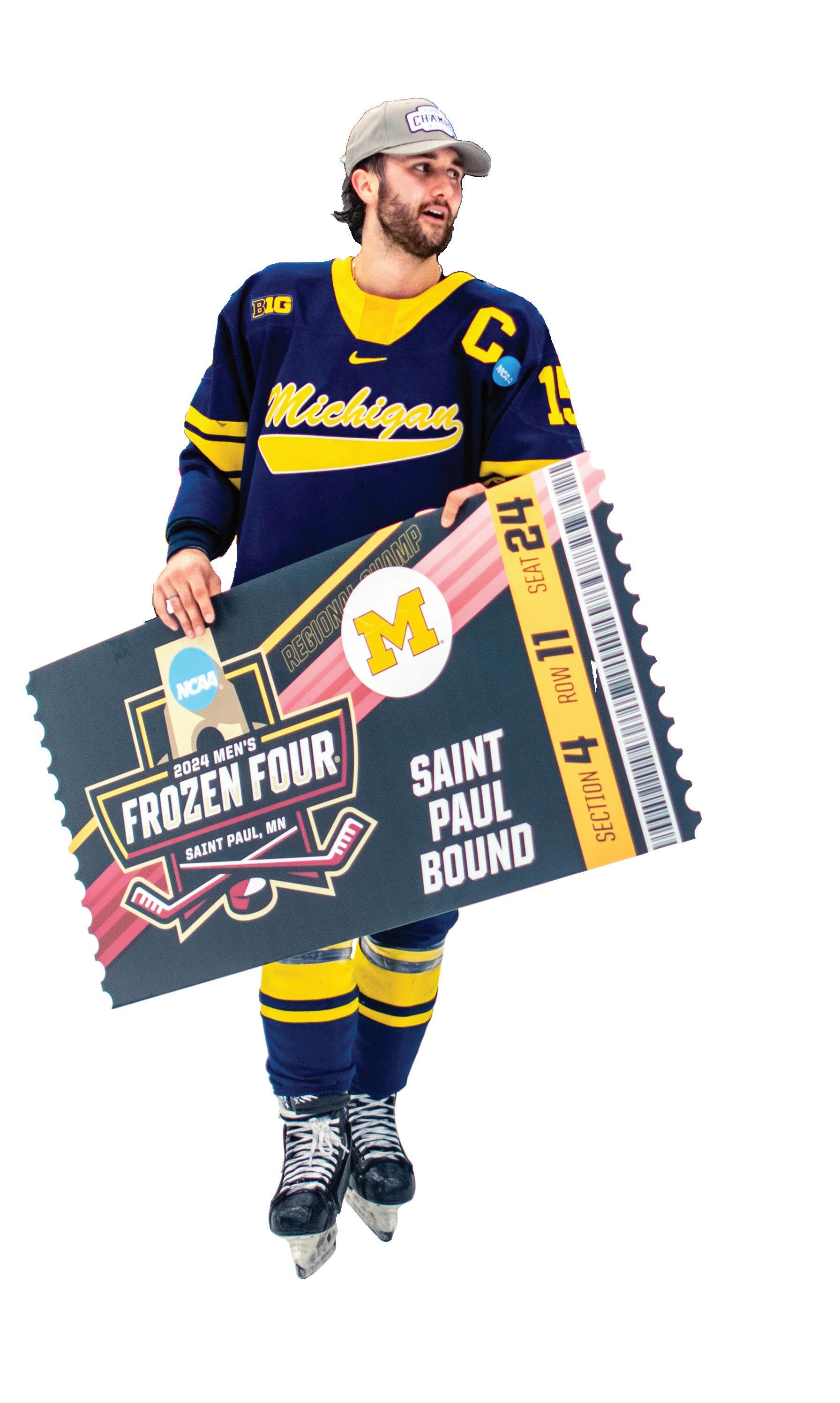The Wolverines barely had time to celebrate that go-ahead goal before scoring another. Picking up a cinematic between-the-legs pass from sophomore forward Frank Nazar III, sophomore forward Gavin Brindley put Michigan up 4-2, just 12 seconds after Duke’s score. “It’s huge,” Brindley told The Michigan Daily. “I think any shift after a goal is big with the momentum. So anytime you’re on the ice after a goal, you try to keep that momentum. That was a big goal for sure.” Michigan State took another penalty in the waning minutes, giving the Wolverines their fifth power-play opportunity — and this time, they capitalized. Duke scored his second of the game, and Michigan iced the victory with just under two minutes left. “We got that big goal at the end,” Nazar said. “Yeah, we gave up two on the PK but we were able to score that one on the power play at the end and shut the game down.” Even without one of their most important players in sophomore defenseman Seamus Casey — who was sidelined after an apparent injury in Friday’s game — the Wolverines rode their third-period momentum to the final buzzer. They locked down on defense, with Barczewski standing tall behind them, and kept their season alive and well. The Spartans might hold a 4-2 record over Michigan this season, but the Wolverines showed out when it mattered most, with their season on the line. Above all else, Sunday’s victory earned Michigan another trip to the Frozen Four. But perhaps as an added bonus, the Wolverines punched that ticket by way of ending their biggest rival’s season — and with it, they finally brought meaning back to the ‘little brother’ label. LYS GOLDMAN Daily Sports Editor Michigan punches third straight ticket to Frozen Four, beats Michigan State 5-2 in NCAA Regional Final LILA TURNER/Daily Design by Lys Goldman The Michigan Daily — Page 12 Wednesday, April 10, 2024 michigan 5 michigan STATE 2