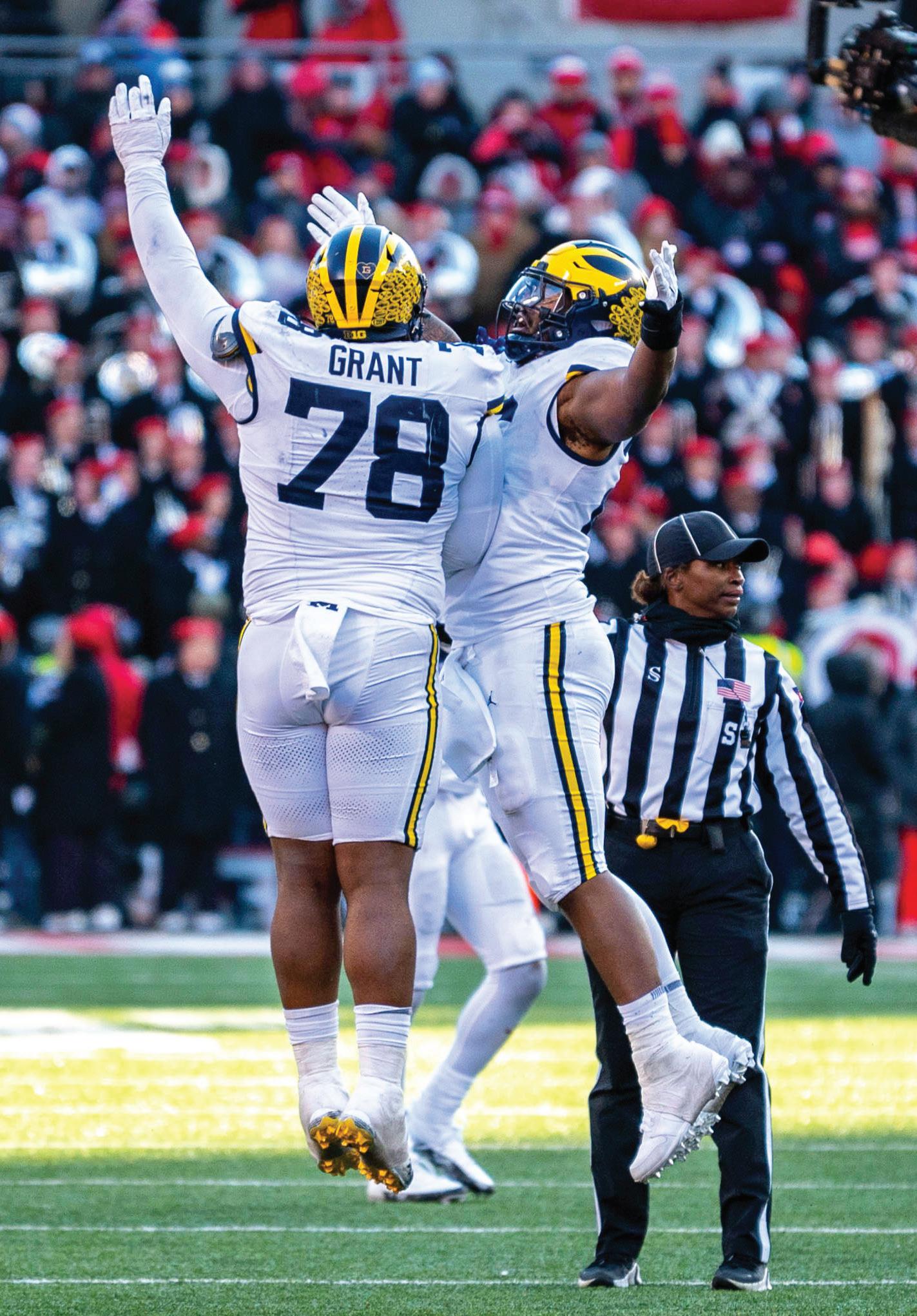 On Ohio State’s third play of the drive, Hall jumped a route on the sideline to pick Howard off, before he took the ball all the way back to the 2-yard line. There, Mullings punched it in two rushes later to give Michigan a 7-3 lead, refusing to be denied again. With some help from special teams in the form of a missed Buckeyes field goal and a 54-yard make by junior kicker Dominic Zvada, Michigan took a touchdown lead up to the twominute mark of the first half. But once Ohio State upped the tempo during its ensuing two-minute drill, it found its only real success in the game. Quarterback Will Howard piloted a smooth nineplay, 75-yard drive, capping it off with a wide-open touchdown pass to wideout Jeremiah Smith to tie the game at 10-10. As the teams entered their respective tunnels, momentum swung in the Buckeyes’ favor. A once-booing crowd began erupting in cheers. But Michigan’s defense refused to let