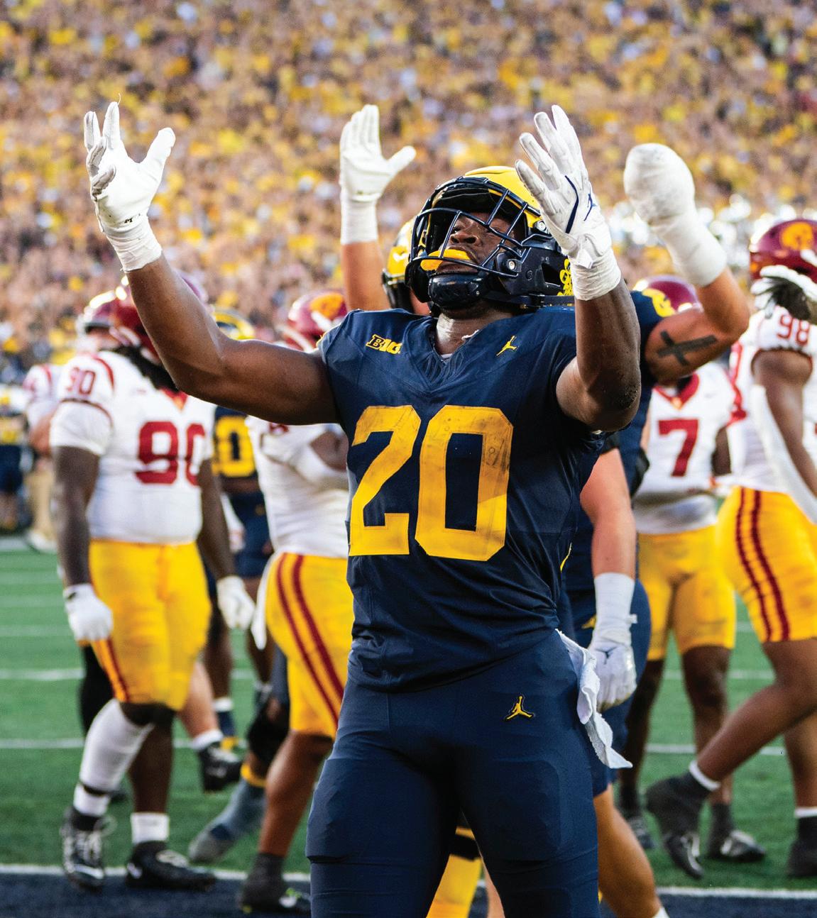 end of the opening quarter. Spurred by a key fourth-down conversion on the previous play, Mullings found a small hole and turned it into a big one. He put Michigan on the board with a 53-yard house call. Continuing to dominate the field-position battle and the line of scrimmage, the Wolverines forced four consecutive USC punts before extending their lead midway through the second quarter. Senior running back Donovan Edwards’ patient running paid off as he contributed a long touchdown of his own, bouncing left for a 41-yard score. The Trojans put up their first points with a field goal late in the second quarter, but Michigan’s