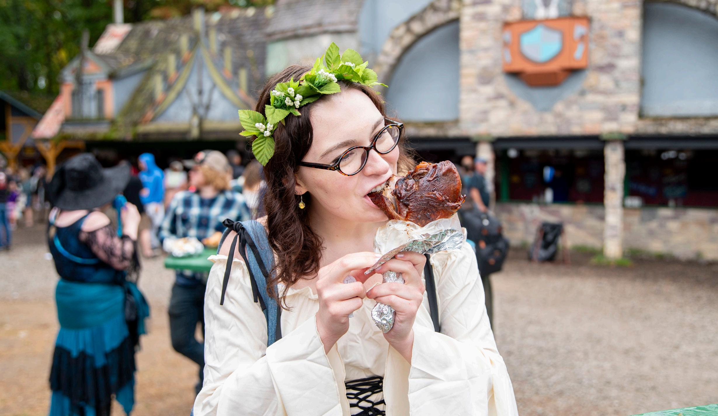 foods appear through windows cut into that wall. We walked up to the segment painted “TURKEY LEGS” and peered at a metal platter of foilwrapped goodness. The people in front of us asked for hot sauce, something the food service workers were not prepared to offer. The servers had cool, historiclooking braids, but mostly they seemed like normal locals trying to survive the craziness of a seasonal job. They were relieved to hand us our meat hocks without any added hassle.