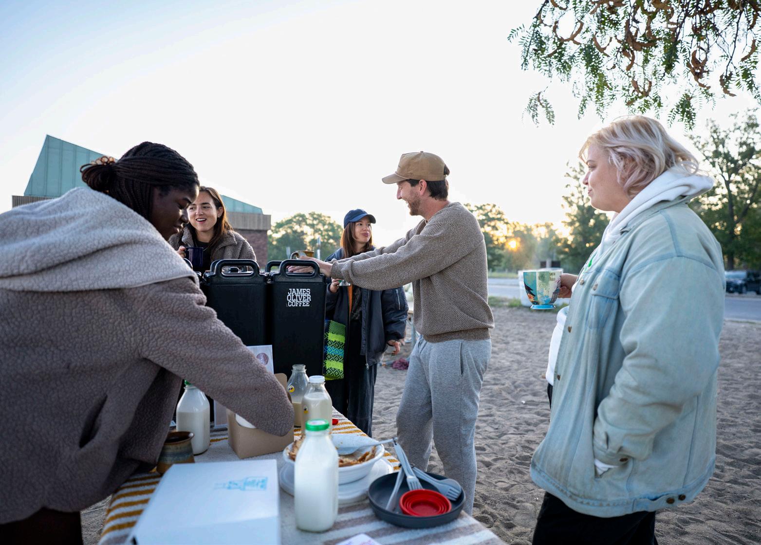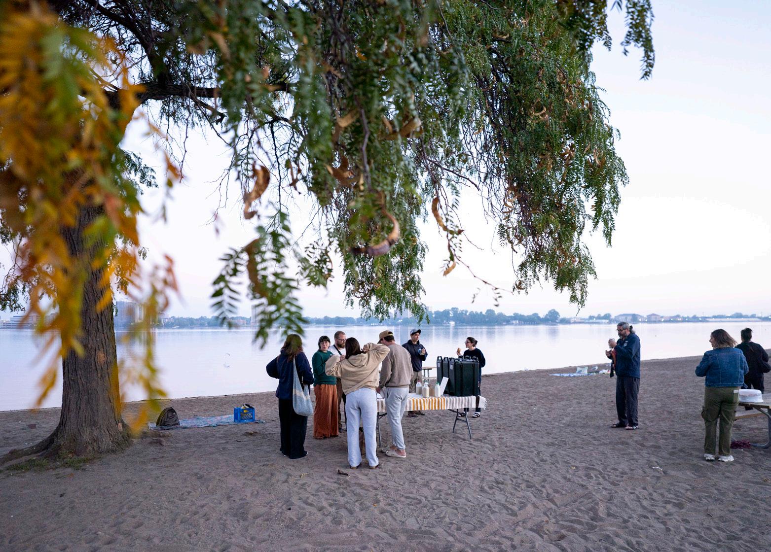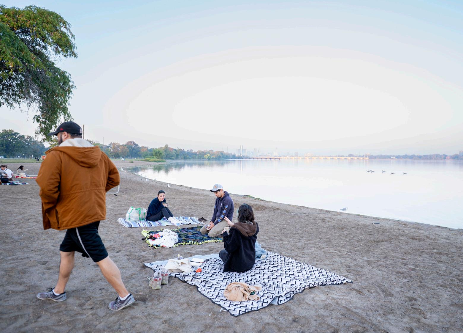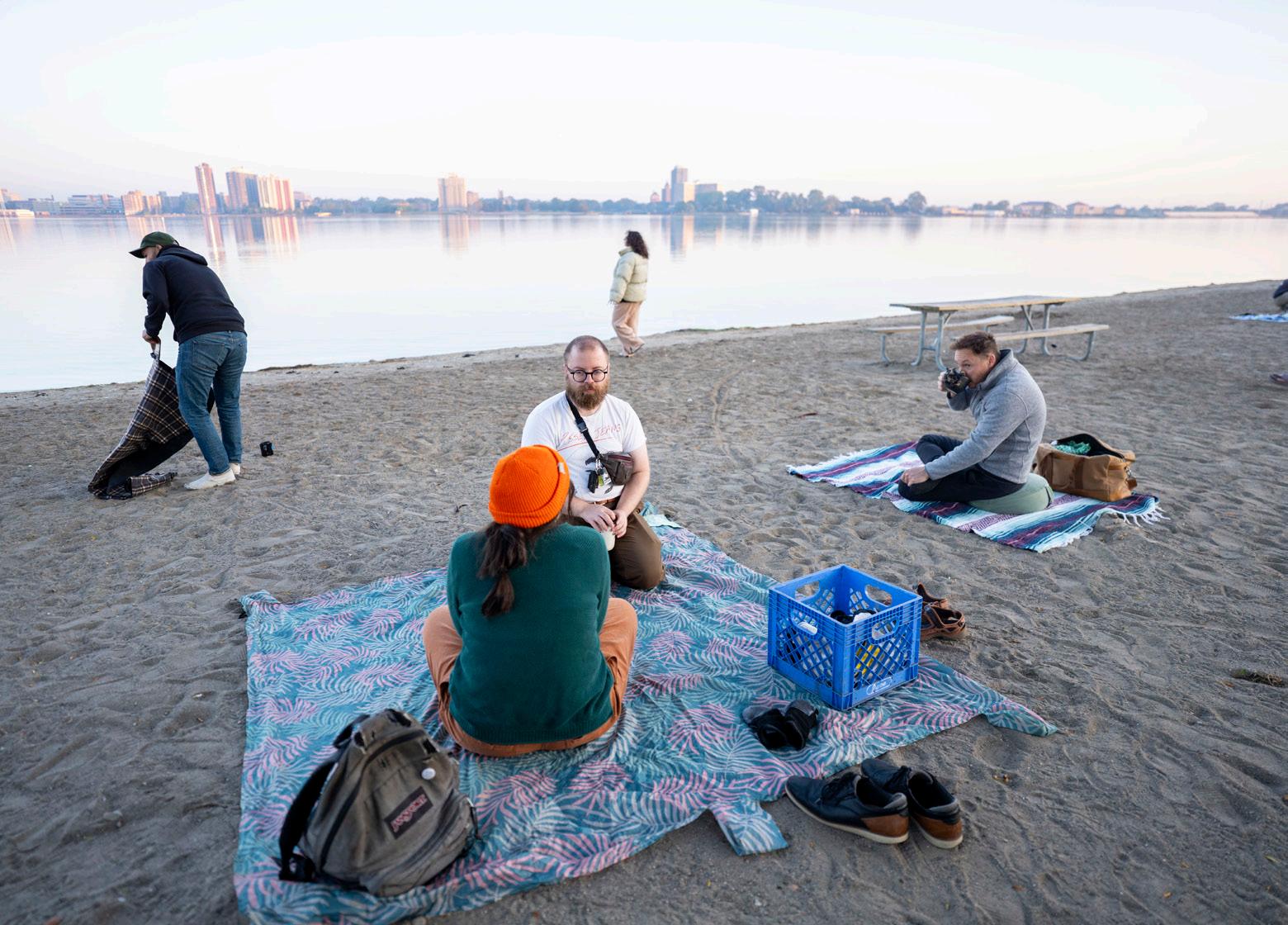 out of place I seemed. But that’s not how swim club operates at all — people come with friends, sure, and people certainly make friends at swim club, but I’d say at least one-third of swim clubbers show up alone and nobody bats an eye. Swim club is built this way by design; it’s a space where you can find community in conversation and laughter, or you can find community through enjoying a moment of solitude in a shared space, and both are equally respected choices. Now, going to swim club feels easier knowing that there are no barriers to entry. When I went this September, I took the second half of the morning to enjoy my own company. I took notes in my journal about the scene unfolding around me — a horde of bikers in a V formation crossing the bridge in the distance, seagulls mingling with humans but keeping a surprisingly respectful distance from their food, a man in waders with a metal detector looking for treasures out deep in the water. I traced spirals in the sand and felt around for a rock to bring home for my roommate. Spilling a drop on my sleeve, I sipped my coffee and felt its warmth unfold in my chest. What a beautiful way to spend the morning. For the first hour, I spoke with a couple of swim clubbers, hesitant to disturb their pocket of peace but curious about what brought them to Belle Isle that morning. Grace Pawluzka, who came alone, told me she heard about swim club from her sister and had been itching to come all