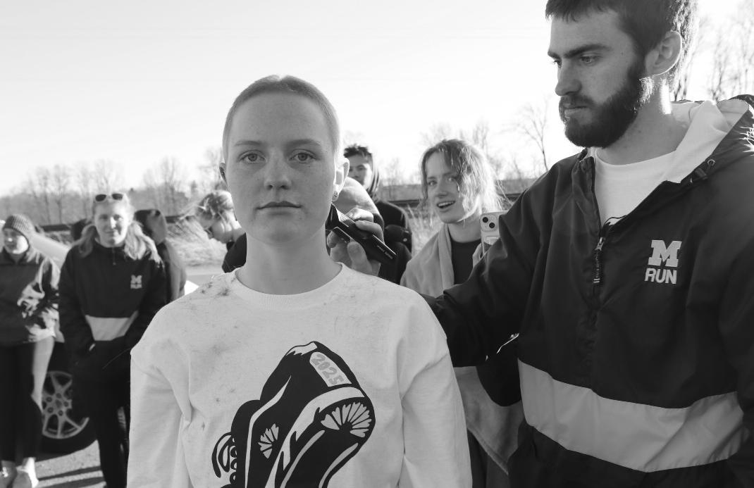 In Albion, a handful of white university-issued Chrysler Pacificas were parallel parked in the ditch outside some gated-off parking lot we were hoping to have access to beside a quiet country road. We were midway through participating in the University of Michigan Running Club’s biggest fundraising event of the year: Race Across Michigan, a 184-mile relay run across the state to raise money for Area 20 Special Olympics. I had said I would shave my head if I received a certain amount of donations, so now I had to keep my word. The masses filling these vans assembled to watch and partake in the spectacle: something like 20 different people tentatively bringing the batterypowered electric shaver to my head and shaving off another portion of my recently attained bowl cut. After everyone played their part in the novel patchiness that had taken over my head, my friend efficiently finished the job and secured me my very first buzzcut.