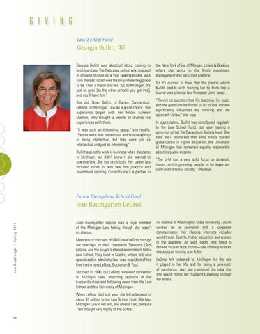 Jean Baumgarten LeGros Jean Baumgarten LeGros was a loyal member of the Michigan Law family, though she wasn’t an alumna. Members of the class of 1945 knew LeGros through her marriage to their classmate Theodore (Ted) LeGros, and the couple’s shared commitment to the Law School. They lived in Seattle, where Ted, who specialized in admiralty law, was president of the firm that is now LeGros, Buchanan & Paul. Ted died in 1990, but LeGros remained connected to Michigan Law, attending reunions of her husband’s class and following news from the Law School and the University of Michigan. When LeGros died last year, she left a bequest of about $1 million to the Law School Fund. She kept Michigan Law in her will, she always said, because “Ted thought very highly of the School.” 38