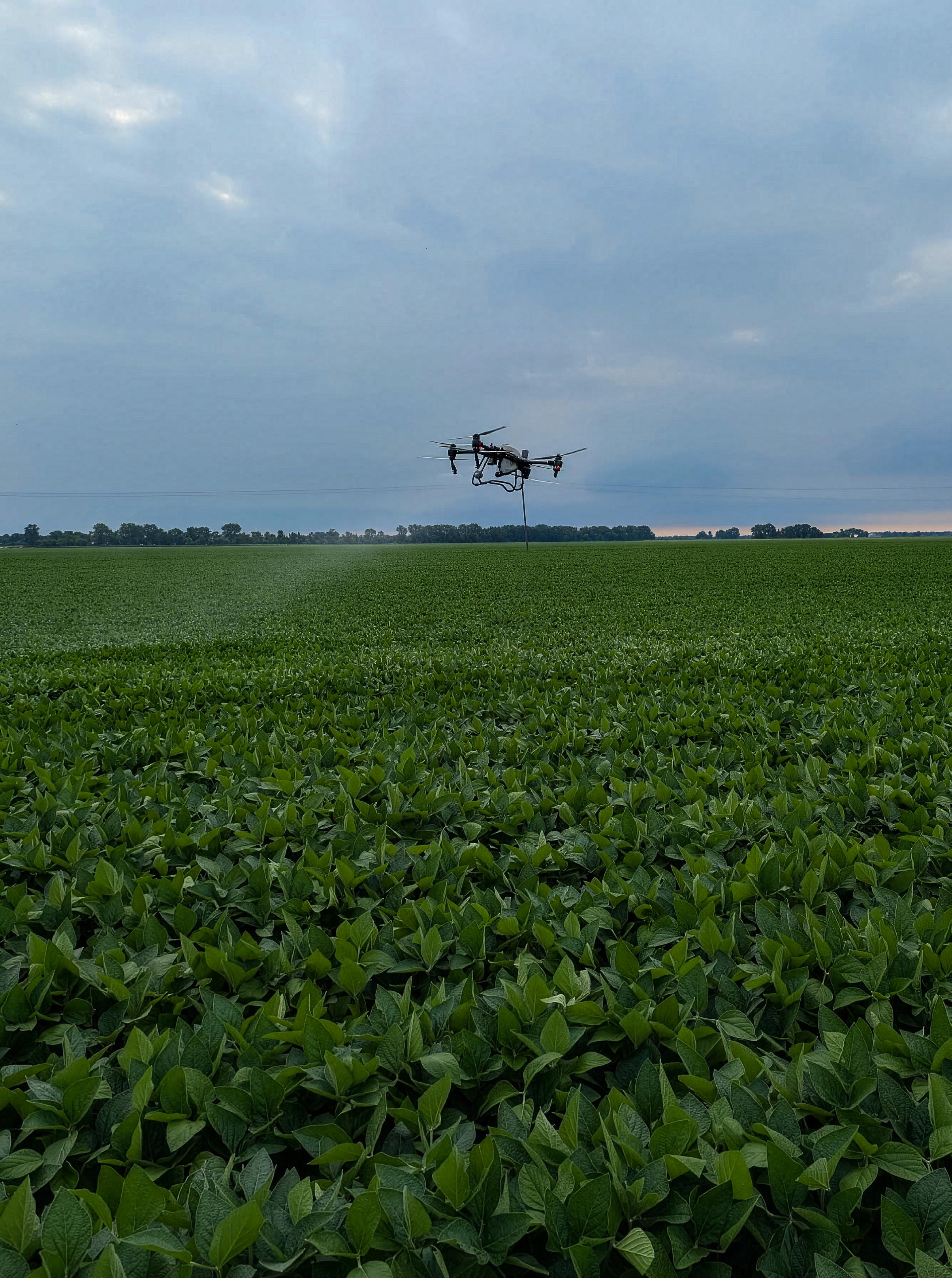control have driven greater interest in UAV pesticide application services in Michigan. Additionally, drone sprayers may allow farmers to treat weed escapes, patchy infestations, or wet areas where ground equipment cannot operate in time, helping ensure that fast growing weeds are sprayed before they become too large to control. While drone applications have been used primarily for fungicides and insecticides, several Michigan applicators have begun offering herbicide applications using UAVs. Herbicides such as glyphosate (Roundup PowerMax 3) and glufosinate (Liberty/ Liberty Ultra) already allow aerial applications under their labels, making drone based herbicide delivery a feasible option. As UAV technology advances and more operators enter the market, costs are expected to decrease, making UAV herbicide applications increasingly practical for Michigan soybean growers.