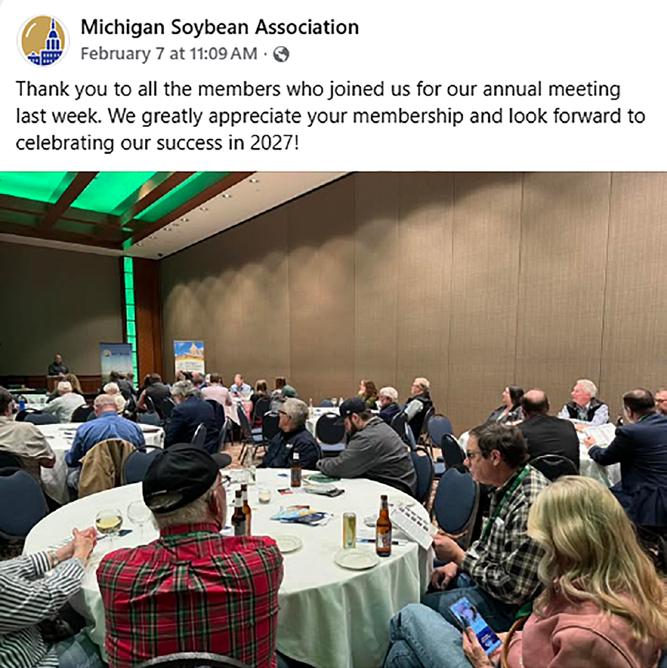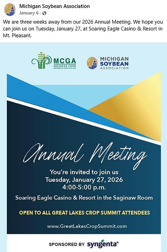 The Michigan Soybean Association held their 52 nd Annual Meeting of members in conjunction with the Michigan Corn Growers Association at the Great Lakes Crop Summit in Mt. Pleasant on January 27, 2026. Over 80 members were in attendance. A recap of 2025 MSA events was provided, including recognition of the scholarship and yield contest winners. In addition to the regular business meeting, the director election results were announced. Districts 1, 4 and 7 were up for election this year.