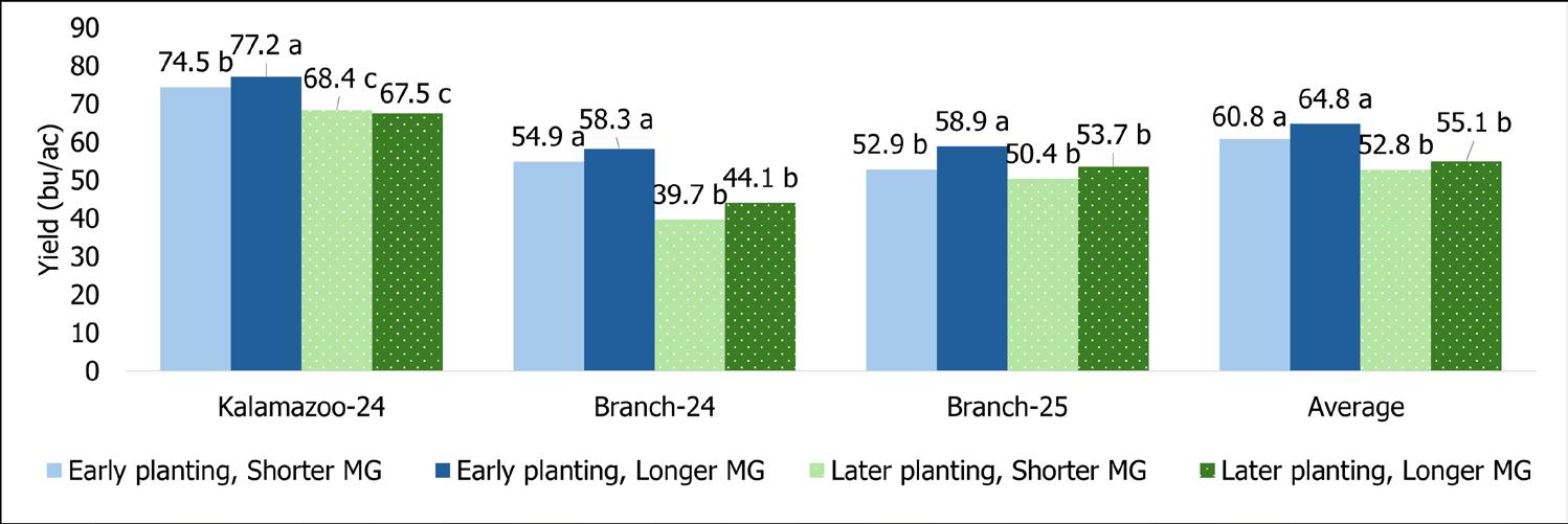 UW-Madison show maximum yields were achieved with longer MGs and earlier planting, although yields were similar across a spread of one full MG. Data from on-farm trials in Michigan show a similar pattern of statistically higher yields with longer MG varieties when planting early at two of three locations (Figure 1). However, University of Nebraska-Lincoln researchers suggested choosing varieties with proven yield performance was a better predictor of yield than MG.