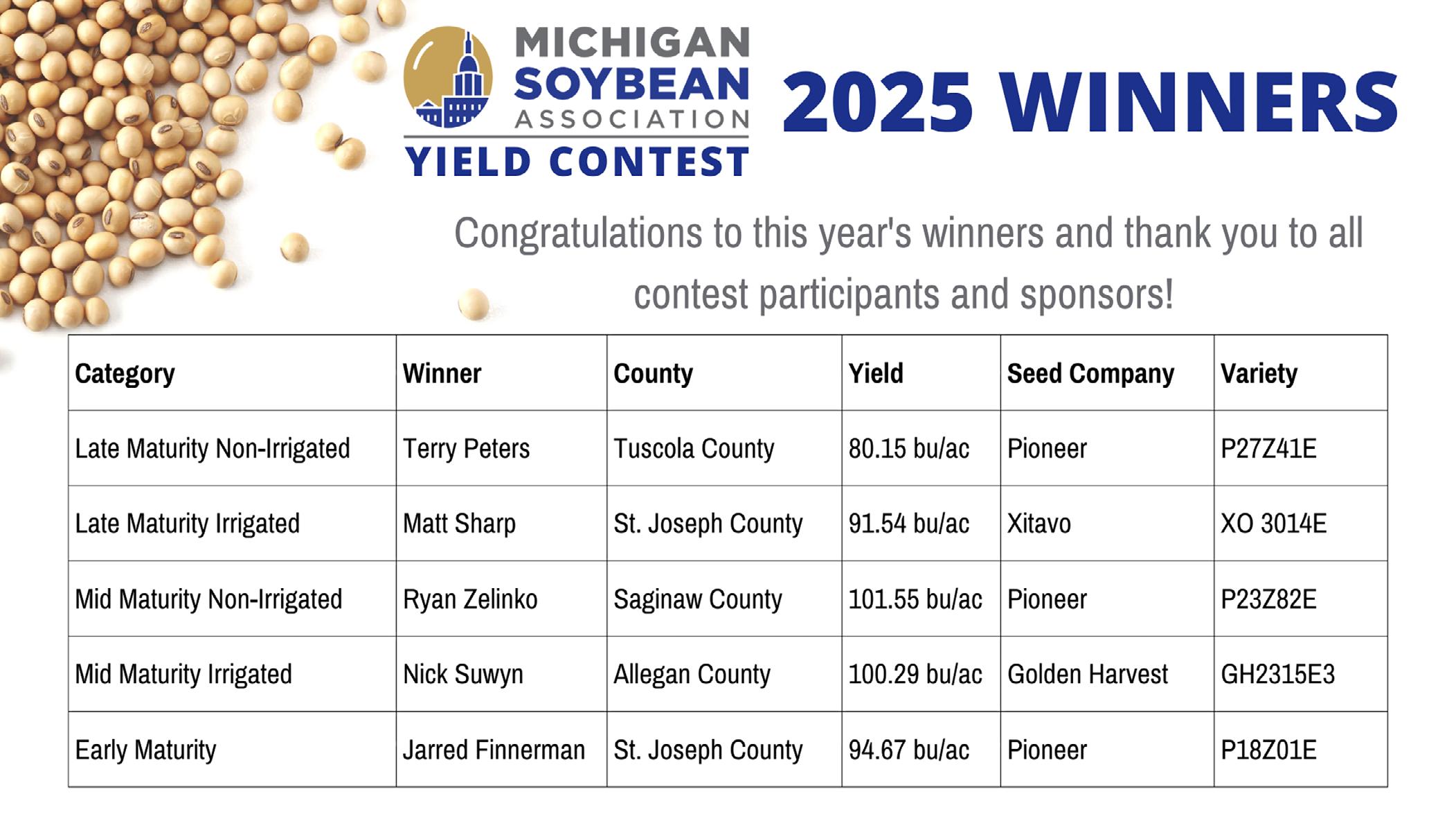 The 2025 contest was supported by the Michigan Soybean Committee, MSA and our seed company sponsors including 3G Seeds, Asgrow, Beck’s, DF Seeds, Golden Harvest, Pioneer, Renk, Xitavo and ZFSelect. Thank you to these partners and sponsors who share MSA's commitment to advancing Michigan soybean production.