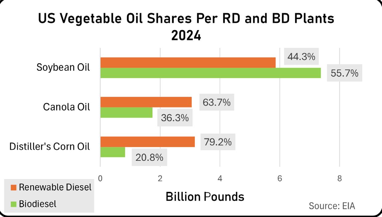 Behind soybean oil, the other top feedstocks for biofuels in 2024 were animal fats, used cooking oil (UCO), canola oil and distillers corn oil (DCO) (Figure 1.) BD production plants favor soybean oil as a feedstock, while RD plants used more canola oil and DCO in 2024 (Figure 2.)