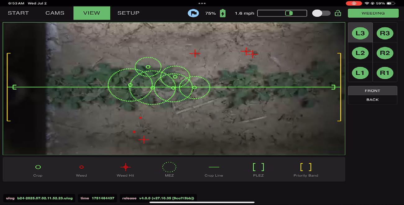 Compared to other precision systems that record the location of a weed in two-dimensional space, Aim & Apply builds a three-dimensional copy of the field on the go and then based on the location of the weed, the location of the turrets, and the volume of space occupied by plants, the system determines which turret can take the best shot without hitting the crop and assigns that turret to the target weed. Because the head of the turret acts like a ball and socket, it can rotate to hit angles forward, backward, and to the side, which allows the turrets to shoot under the crop canopy and hit weeds that are close to the crop. Additionally, if coverage is needed due to using a contact herbicide, the system can operate in Size Dependent Shot mode, which allows the turret to “twirl” and deposit a spiral pattern shot that covers the leaf surface. The system determines the size of the weed which in turn determines the size of the spiral pattern the turret applies. Both Single Shot and Size Dependent Shot modes deliver herbicide very precisely onto the target with minimal overspray.