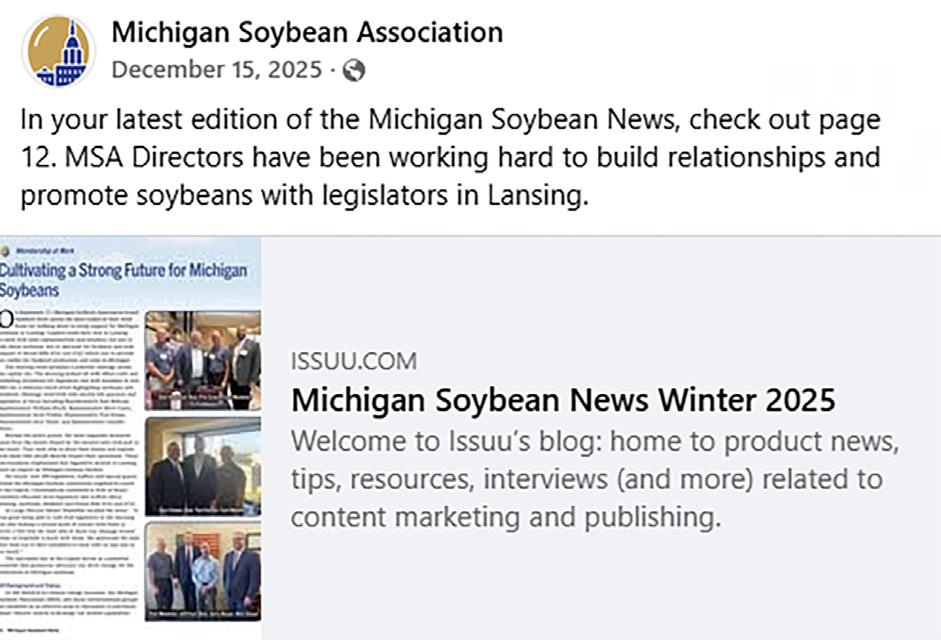 Advertisements within this publication contain the opinions and information of the advertisers and do not necessarily reflect the opinions or views of the Michigan Soybean Association or affiliated groups. The United Soybean Board/soybean checkoff neither recommends nor discourages the implementation of any advice contained herein, and is not liable for the use or misuse of the information provided.