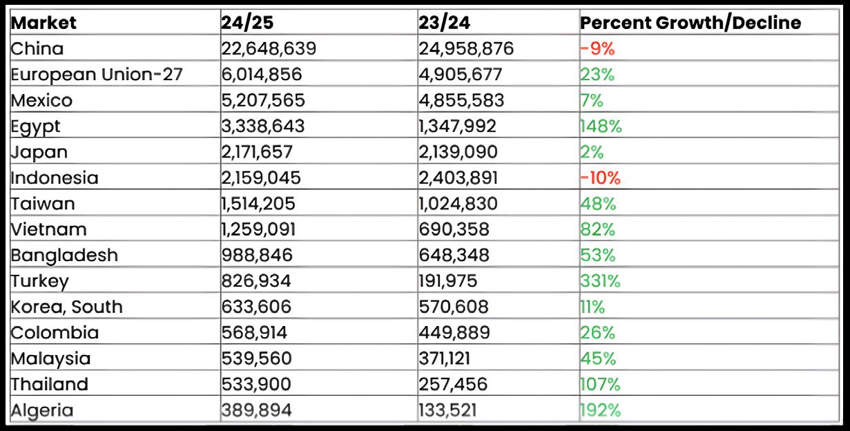 Although final statistics are not yet available for the full year, in marketing year 2024/2025 biofuels production and use of soybean oil declined due to market uncertainty. USDA forecasts 14.5 billion pounds of soybean oil will be used for biofuels production in marketing year 2025/2026.