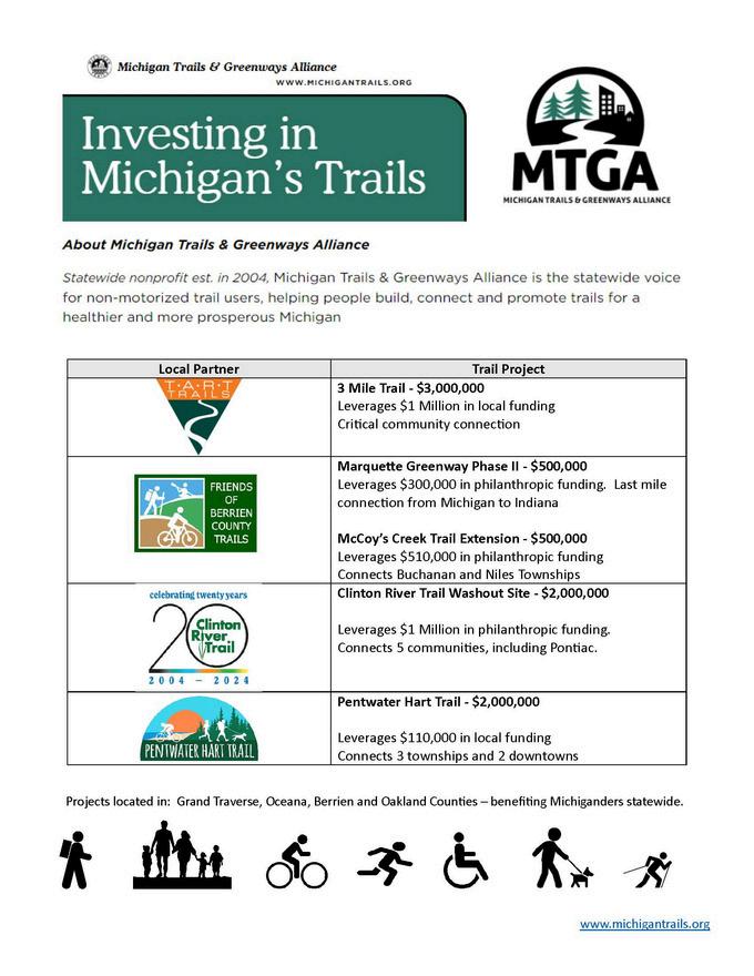 These projects demonstrate the impact of strategic funding in expanding and enh Michigan’s trails. We are grateful to our funding partners for their support in mak initiatives possible.