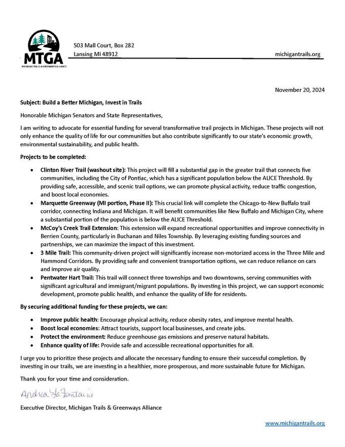 On behalf of the Michigan Trails & Greenways Alliance (MTGA), we extend our deepest gratitude for your ongoing contributions throughout 2024. Your support is invaluable as we work to build, maintain, protect, and connect trail corridors across our beautiful state. For the past 20 years, MTGA has been at the forefront of Michigan's trail movement, and it's because of donors like you that we've been able to make such a significant impact. Think of the miles of new trails, the revitalized communities, and the countless Michiganders enjoying the outdoors – these achievements are a direct result of your generosity and belief in our mission. Michigan is the Trail State because of you.