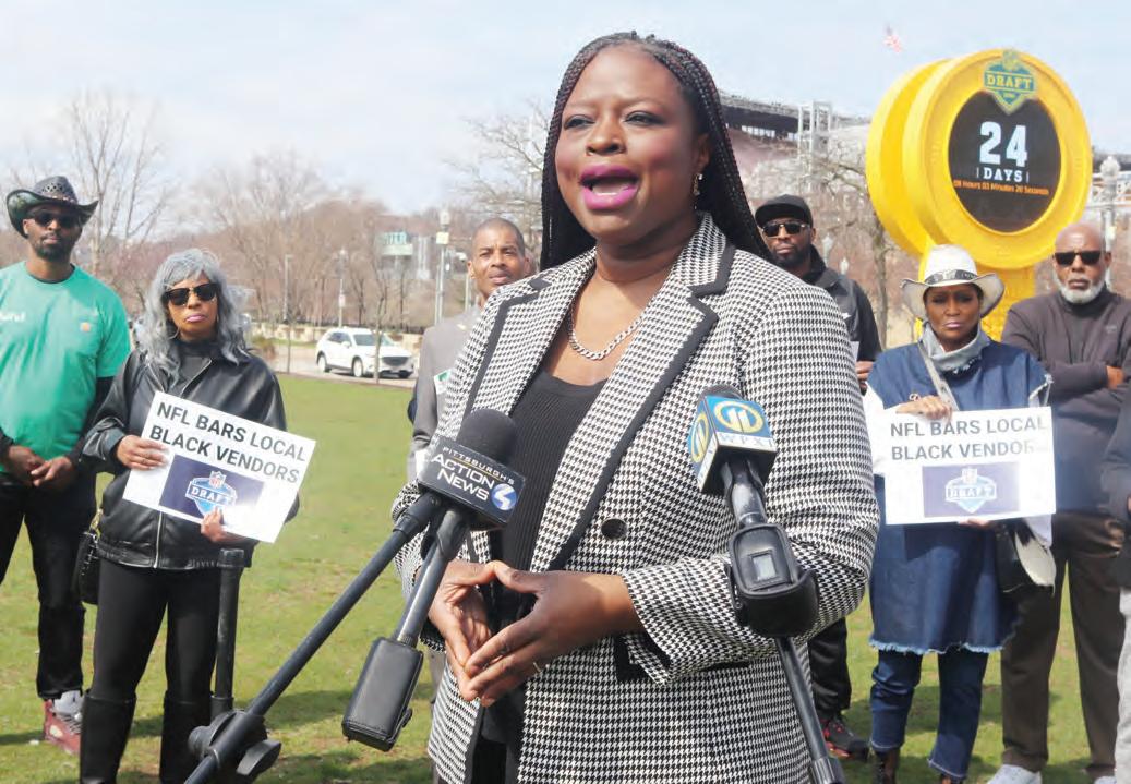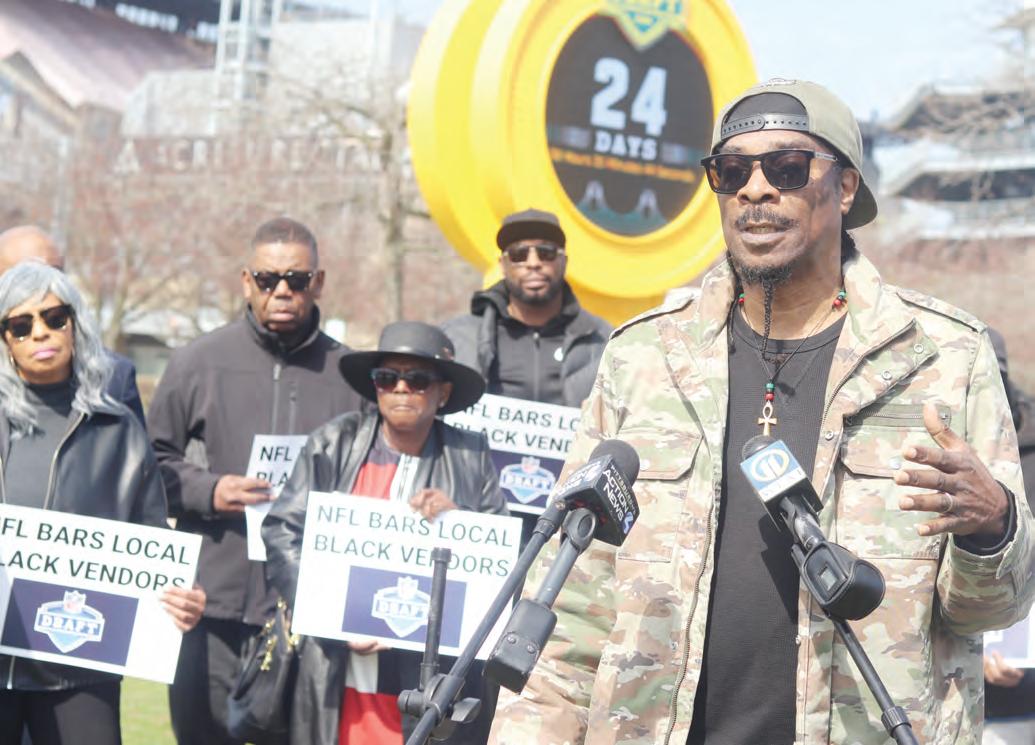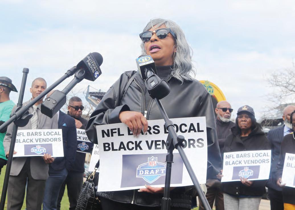 “The NFL has enjoyed the talent of Black athletes,” voiced Nekima Levy Armstrong, co-founder of the national Target boycott and former president of the Minneapolis NAACP, in front of Acrisure Stadium, March 30. “They have also had a history of discriminating against Black coaches as well. And now we are seeing discrimination against Black businesses in Pittsburgh who deserve the opportunity to vend at the NFL Draft.”