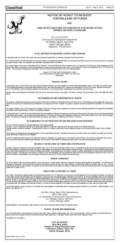 NOTICE OF INTENT TO REQUEST FOR RELEASE OF FUNDS AND FINAL NOTICE AND PUBIC EXPLANATION OF A PROPOSED ACTION WITHIN A 100-YEAR FLOODPLAIN CITY OF DETROIT Planning and Development Department 65 Cadillac Square, Suite 1200 Detroit, Michigan 48226 Telephone: 313.224.0472 TO ALL INTERESTED AGENCIES, GROUPS AND PERSONS In accordance with 24 CFR 58.70, this notice shall satisfy procedural requirements for activities undertaken by the City of Detroit. This notice also informs all interested parties that the City of Detroit has evaluated the potential effects that the proposed project may have on the human environment as required by Executive Order 11988. The evaluation was conducted in accordance with 24 CFR 55.20. On or about August 9, 2013, and in accordance with 24 CFR 58.71, the City of Detroit will submit a request to the U.S. Department of Housing and Urban Development (HUD) Detroit Field Office for the release of Community Development Block Grant funds authorized under Title I of the Housing and Community Development Act of 1974 (Public Law 93-383). Once provided the appropriate authorization, the City of Detroit shall commit these funds to the following project: Abayomi CDC Public Facility Rehabilitation Project Community Development Block Grant (CDBG), 2011 and 2012 $200,000.00