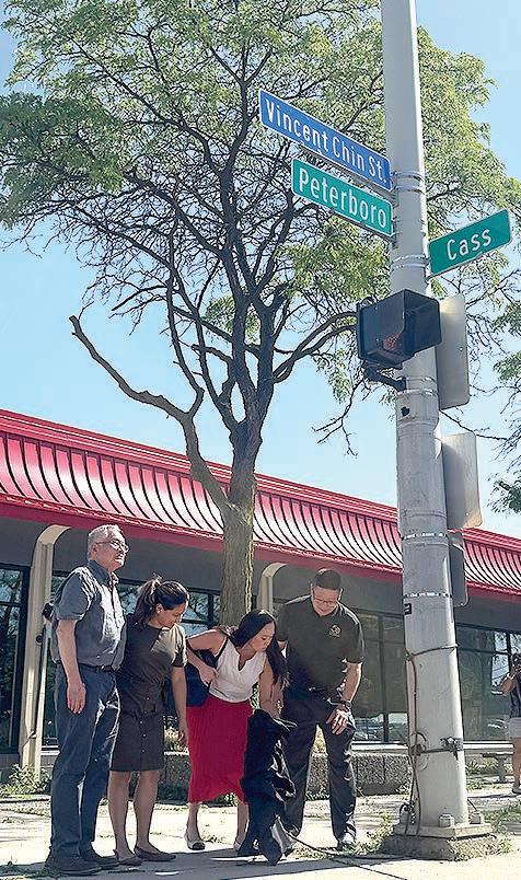 Local lawmakers joined Asian American leaders on Cass and Peterboro Monday to unveil a street sign above Peterboro Street honoring the late Vincent Chin.