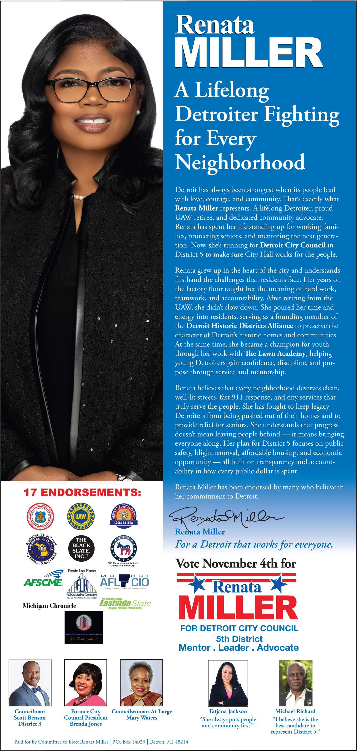 “It is so important to recognize that there are young leaders across the country, many that are born here in Detroit. I represent our city nationally and I tell people, ‘Yea I’m a D-girl I’m from the west-side of Detroit,’” Mitchell expressed. “But more importantly, I’ve been able to have experiences within an industry that not many of us, specifically women of color, have the opportunity to engage in and I’ve been the youngest person in the room, the only Black person in the room, and the only Sistah in the room, and I really had to articulate the importance of showing up, giving chances when others won’t, and being persistent.” As a trailblazing Black woman thriv ing in a predominantly male-dominated industry, her unwavering commitment to fortifying the connections between businesses and Detroit’s communities is unde-