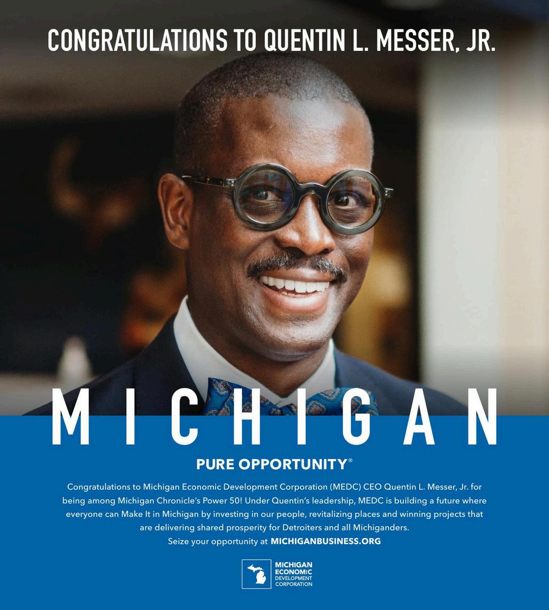 Quentin Messer, Jr. is the CEO and Chief Economic Competitiveness Officer of the Michigan Economic Development Corporation (MEDC) and President and Chair of the Michigan Strategic Fund. In these roles, Messer spearheads initiatives to drive business development, community growth, access to capital, and Michigan's brand enhancement, with a focus on creating a robust, equitable economy. Quentin oversees all aspects of MEDC's programs, funds, personnel, and contracts.