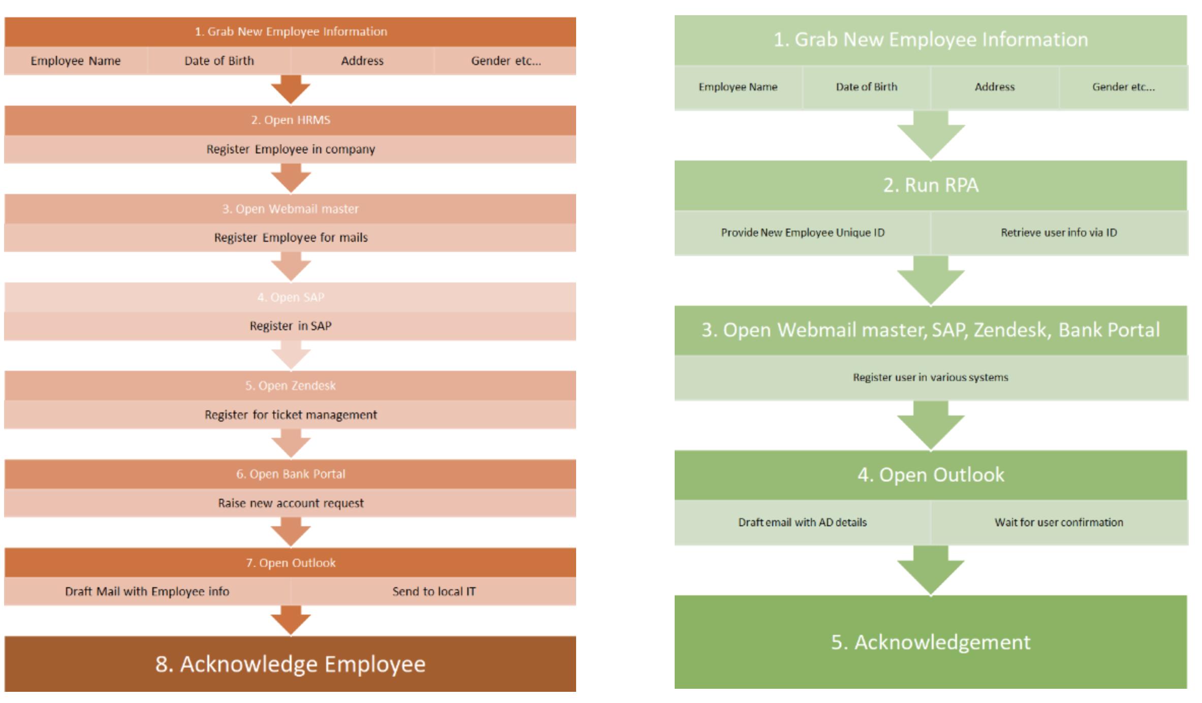 Case: HR manager want a solution that can make employee onboarding easier and reduce efforts to perform same operation again and again. Let’s understand with and example. For a company X, if a new employee joins, then HR is required to create 5 different accounts for various systems where employee can access company data, accounting, mails etc. After that IT person need to be notified after registration so they can create employees AD account. Once employee onboarding process complete system should send email with some details and registration complete acknowledgement to new employee.Let’s find out difference between manual process and RPA with below diagrams.