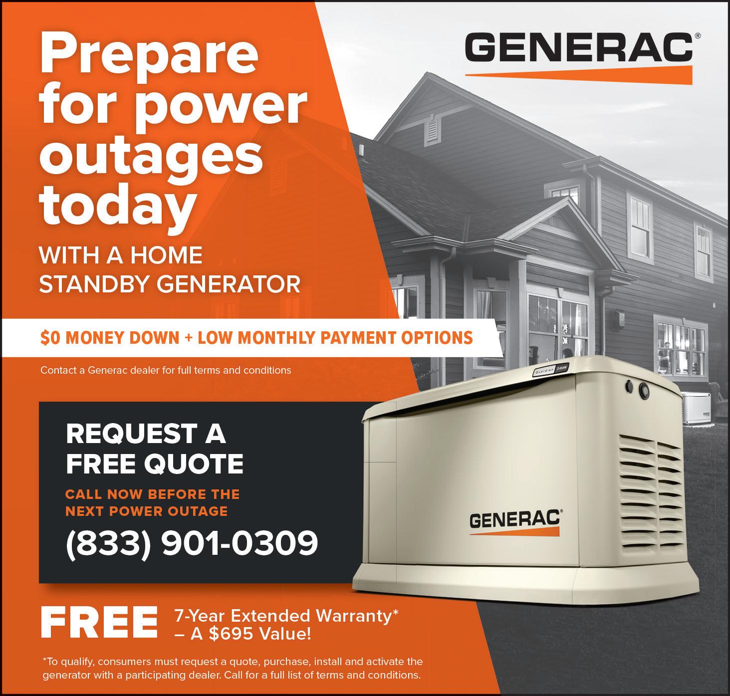 Prepare for power outages today - with a GENERAC home standby generator $0 Money Down + Low Monthly Payment Options. Request a FREE Quote. Call now before the next power outage: 1-833-901-0309. (t/n)