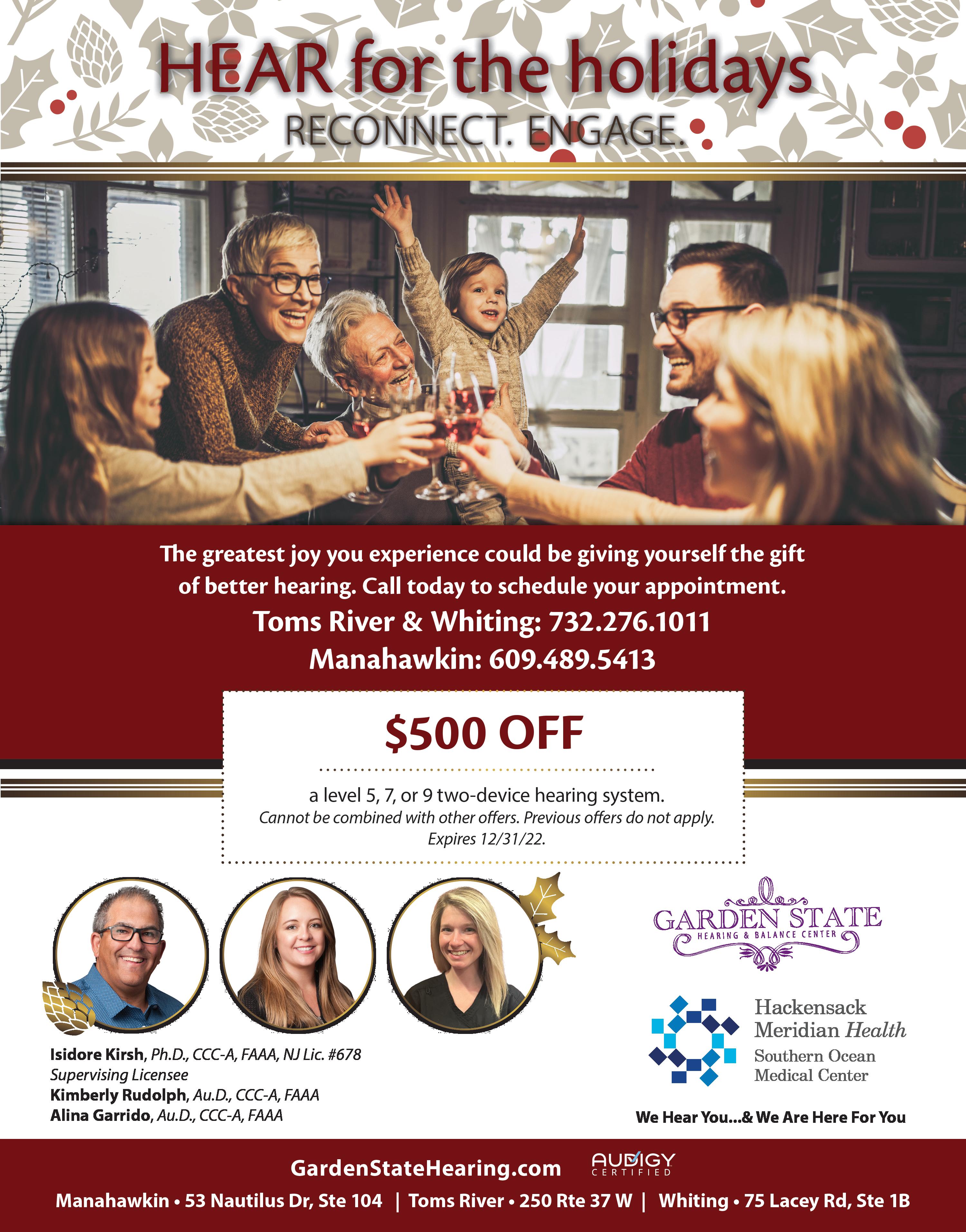 Pictured is Dr. Isidore Kirsh. His offices are located at 250 Route 37 West, Toms River, 732573-4020; 53 Nautilus Drive, Suite C, 1st Floor, Manahawkin, 609-489-5415; 75 Lacey Road Ste 1B, Whiting, 732-606-4912. Visit gardenstatehearing.com for more information.