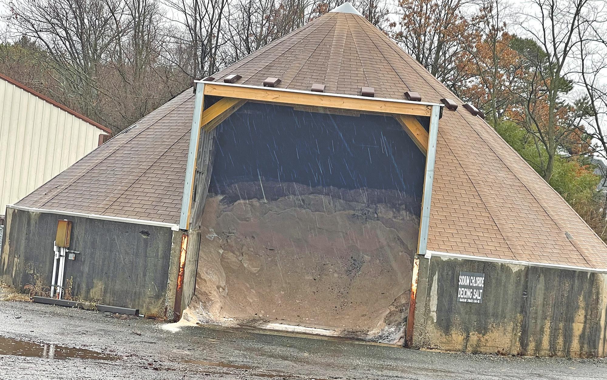 ─Photos by Judy Smestad-Nunn (Top): The township vehicles stand ready for plowing. (Bottom): Brick’s salt houses have 1,200 tons of salt on hand.