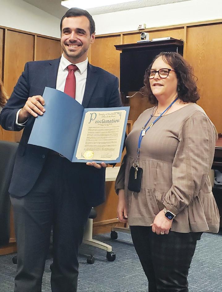 Manchester Library Branch Manager Rachel Cantor accepted the proclamation for National Library week. The proclamation notes that libraries are accessible and inclusive places that foster a sense of belonging and community, connect people to technology, proving access to broadband internet, computers and training that are critical for accessing education and employment opportunities and offer opportunities for everyone to connect with new ideas.