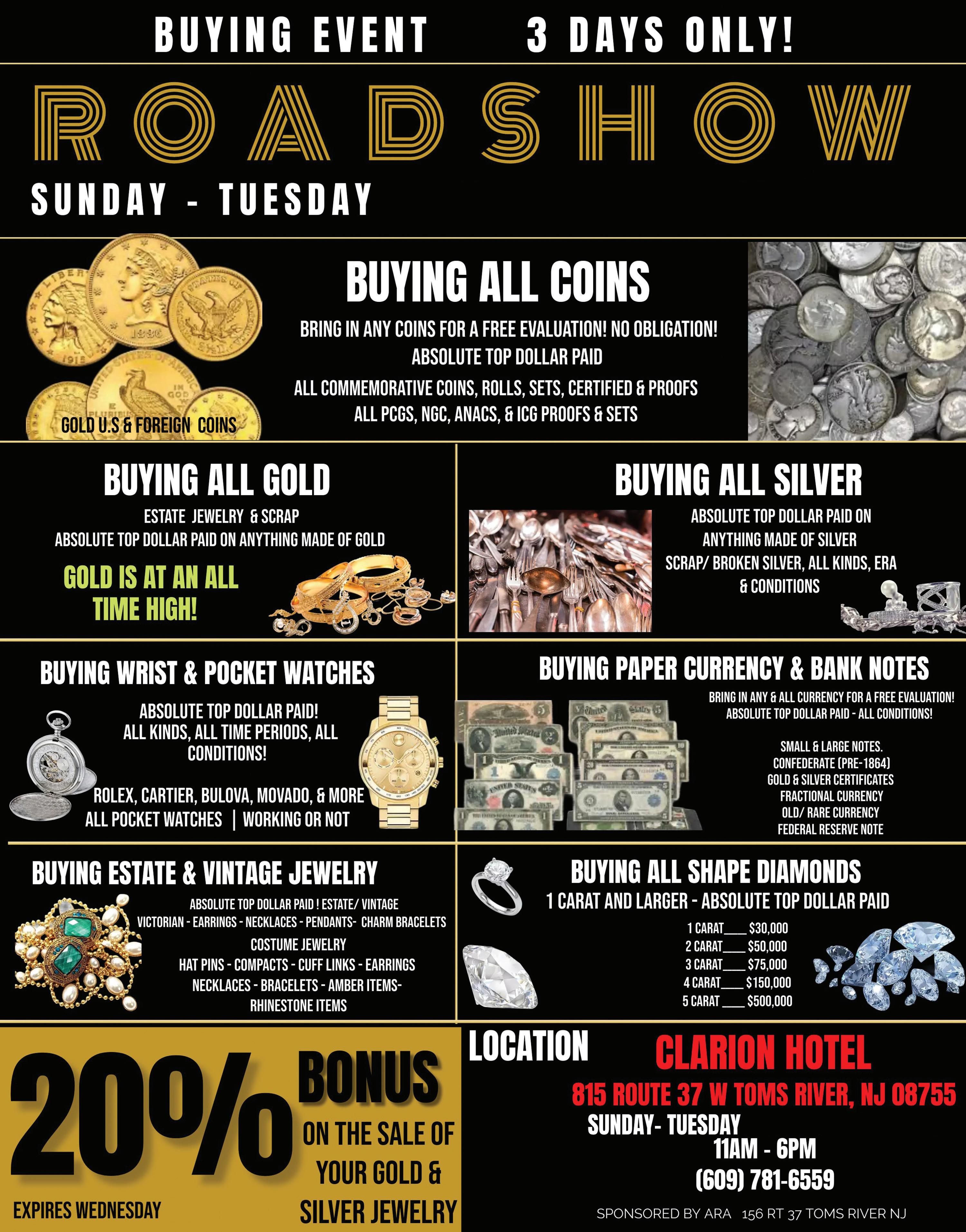 RY Looking to buy costume/estate jewelry, old rosaries and religious medals, all watches and any type of sterling silver, bowls, flatware candlesticks or jewelry. Same day house calls and cash on the spot. 5 percent more with this AD. Call Peggy at 732-581-5225. (t/n)