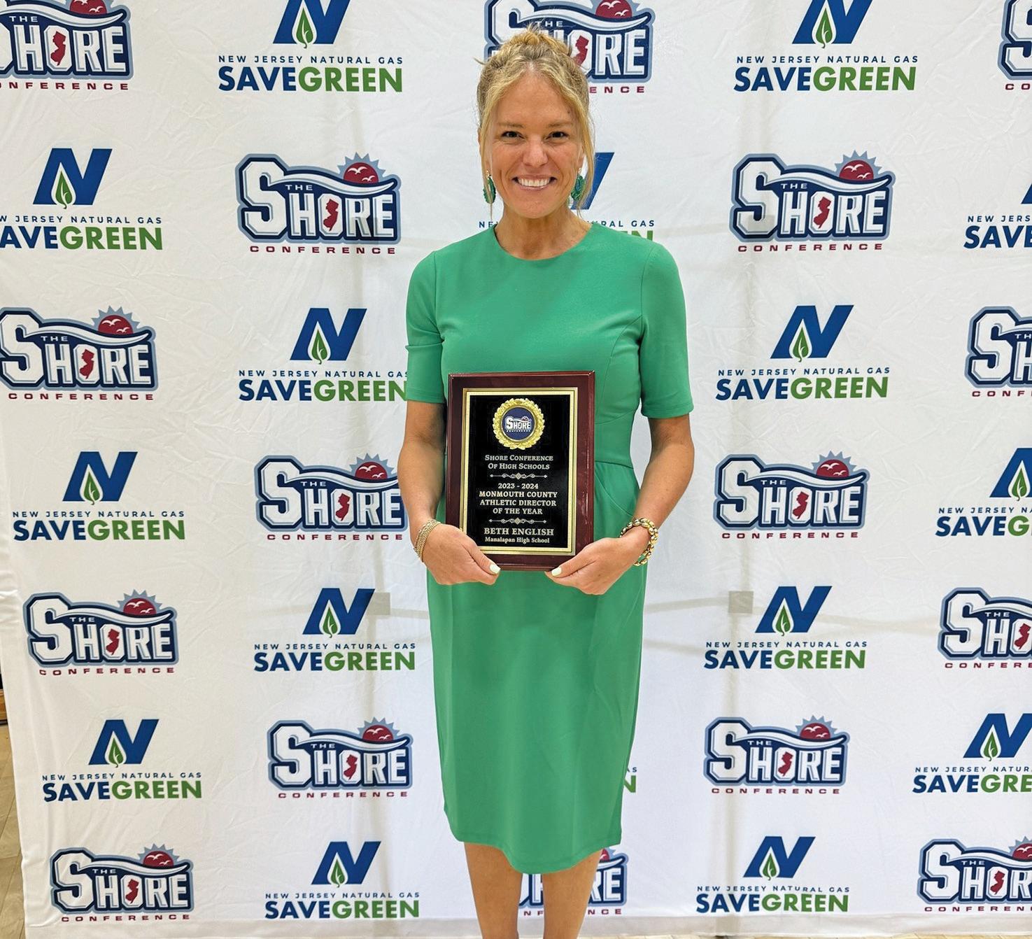 Photo courtesy Freehold Regional District MANALAPAN – Beth English, the Supervisor of Extracurricular Activities at Manalapan High School, was recognized as the Monmouth County Athletic Director of the Year at the Shore Conference Sportsmanship Award Banquet this past weekend!
