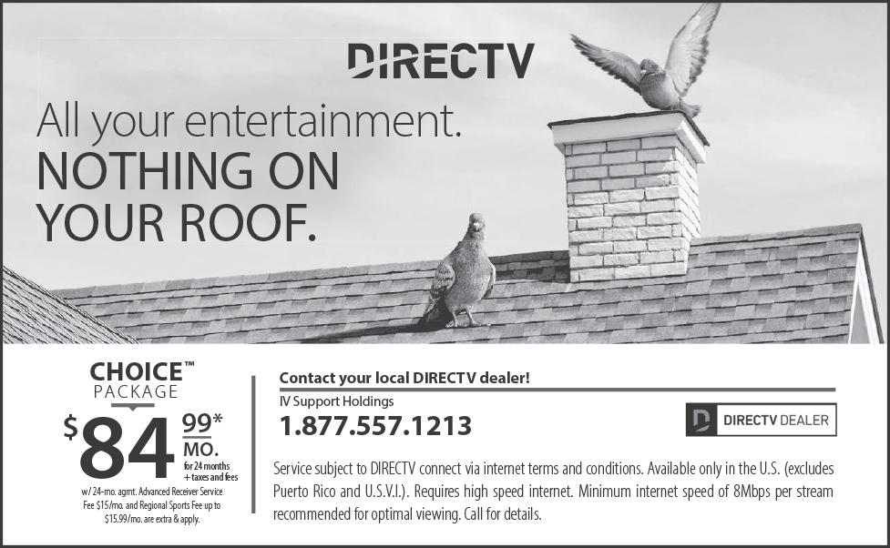 DIRECTV - All your entertainment. Nothing on your roof! Sign up for Direct and get your first free months of Max, Paramount+, Showtime, Starz, MGM+ and Cinemax included. Choice package $84.99/ mo. Some restrictions apply. Call DIRECTV 1-877-557-1213. (t/n)