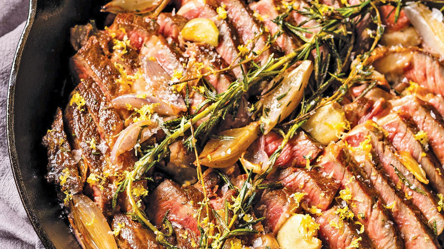 5. Transfer steaks to a cutting board, then return sauce and aromatics, along with any accumulated juices, to now-empty skillet. Slice steaks on slight bias. Return steaks to skillet, arranging aromatics around slices. Sprinkle steaks with lemon zest and flake sea salt. Serve.