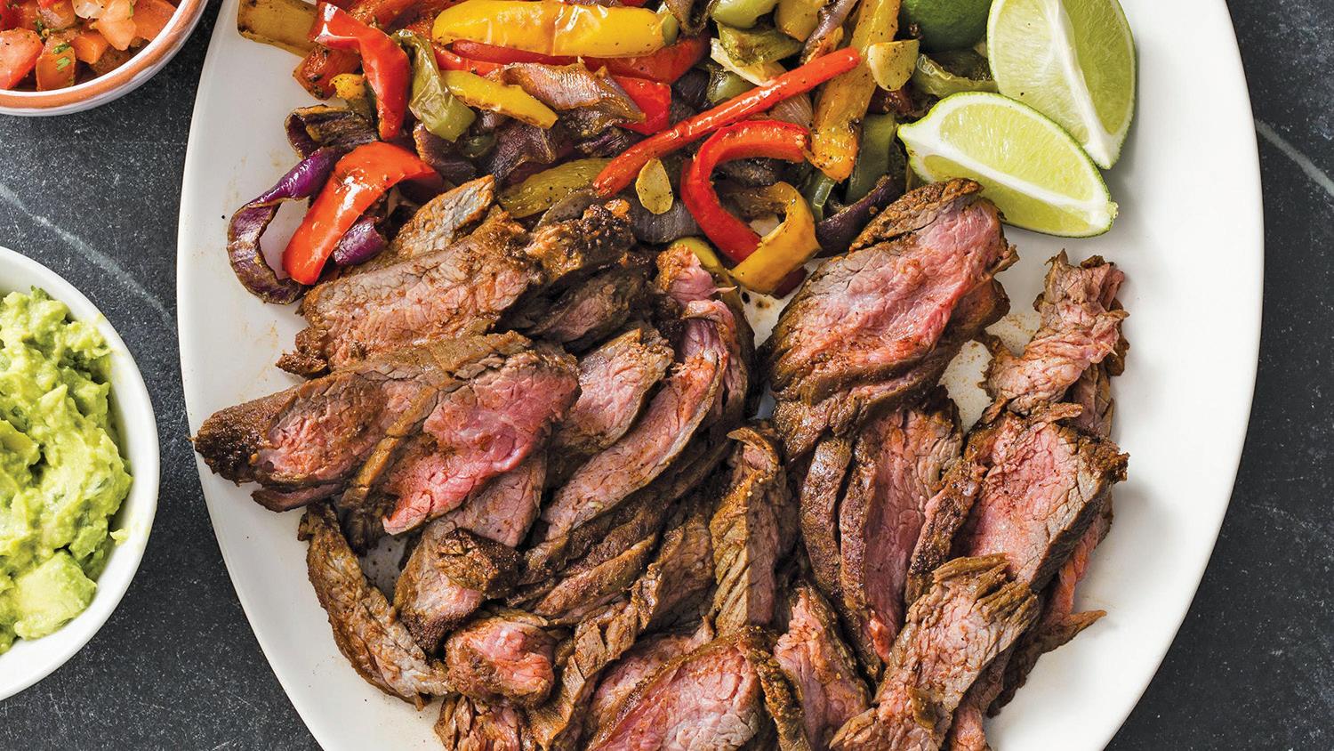 We chose flank steak, preferred by tasters for its beefy flavor, tenderness, and availability. Since we couldn’t sear it on a baking sheet in the oven (even at a hot 475 degrees), we relied on a potent, dark-colored spice rub to make up for the missing flavor and color. A mixture of chili powder, brown sugar, salt, and pepper did the trick. After tossing strips of bell peppers, rings of red onion, and slices of garlic in ve etable oil, salt, and pepper, we spread them out on the baking sheet and slid it into the oven on the lower-middle rack to ensure that the vegetables browned and didn’t steam. We then pushed the vegetables to one side of the baking sheet and added the rubbed steak, cut into three equal pieces, to the other side of the sheet. In just 8 minutes, the meat was at the target temperature of 135 degrees. Cooked to medium instead of medium-rare, the steak was less chewy when sliced and dropped into a tortilla. Once the steak was rested and sliced, we tossed it with the browned, tender vegetables plus chopped cilantro and a spritz of lime juice to brighten the flavors.