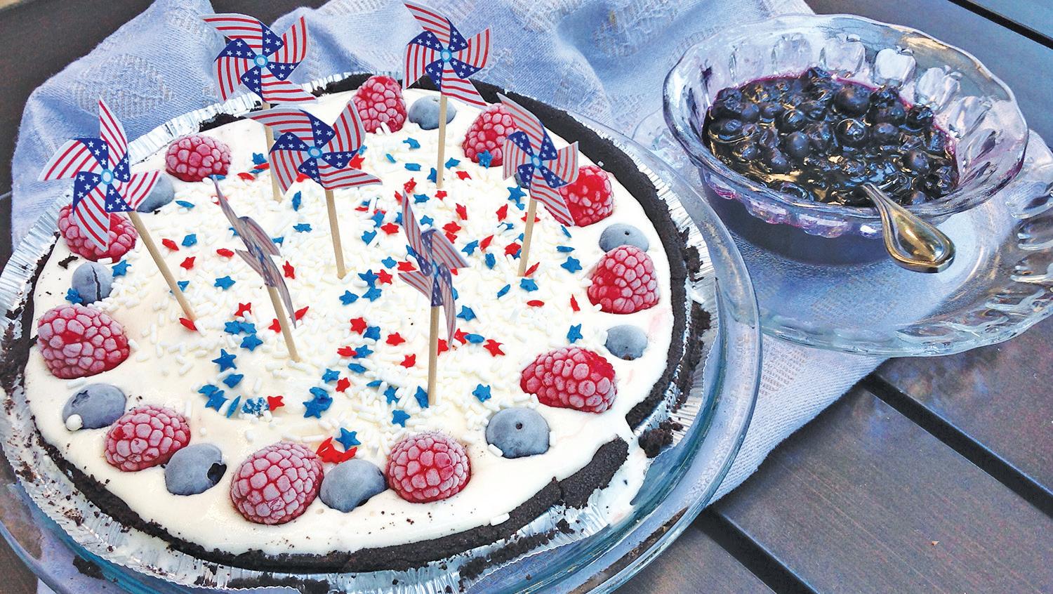 3. Place blueberries and raspberries in a circular pattern on the outside edge of the pie. Place Fourth of July or other cake decorations on top.