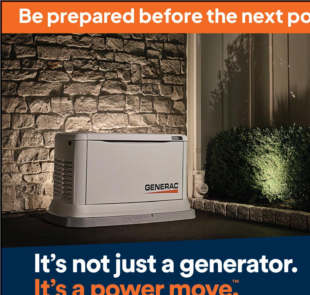 Prepare for power outages today with a Generac Home Standby Generator. Act now to receive a FREE 5-Year warranty with qualifying purchase. Call 1-833-901-0309 today to schedule a free quote. It’s not just a generator. It’s a power move. (t/n)