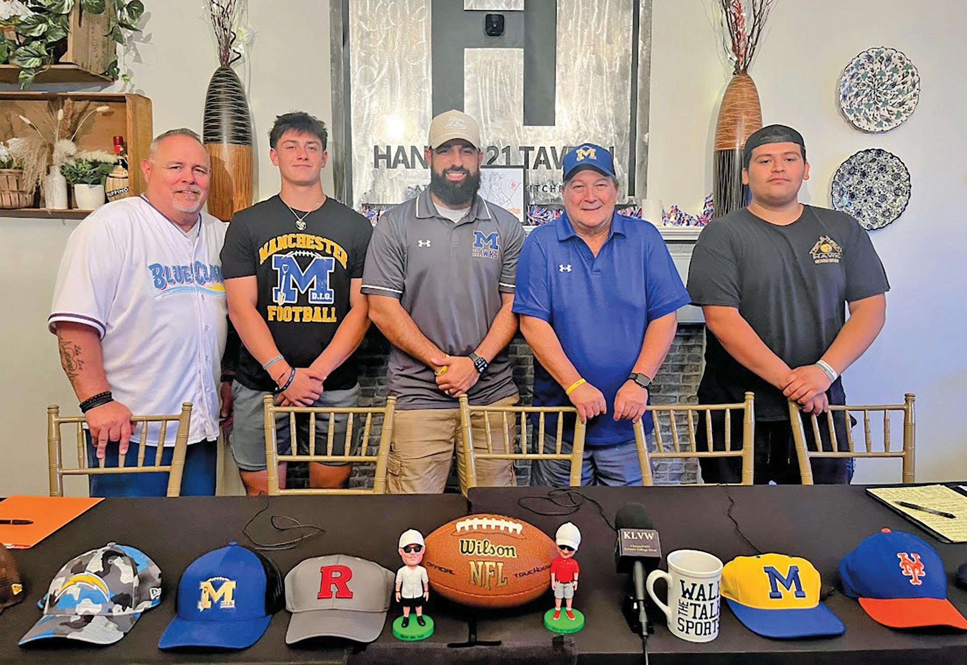 Members of the Manchester High School Hawks football team join their coach; team captains and Leisure Village West Walk the Talk podcast hosts for a pre-season event held at Hangar 21 Restaurant & Pizzeria in Lakehurst.