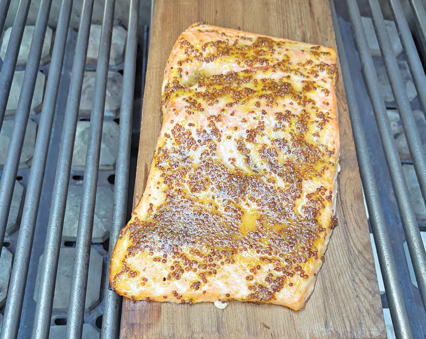 4. Place the fillets on the planks and brush the glaze evenly on the salmon fillets. Place the salmon planks on the grill and close the lid. Cook for 18 to 20 minutes, or until the salmon is just opaque throughout and flakes easily with a fork. The exact time will vary based on the thickness of your fillets and an instant read thermometer reading 130 F to 135 F.