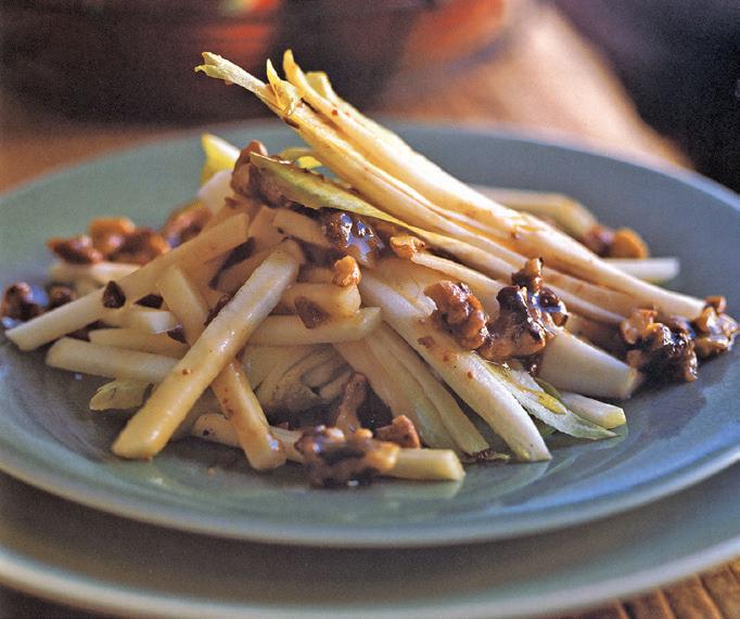 2. In a salad bowl combine the endive and apple strips and sprinkle over the walnuts.
