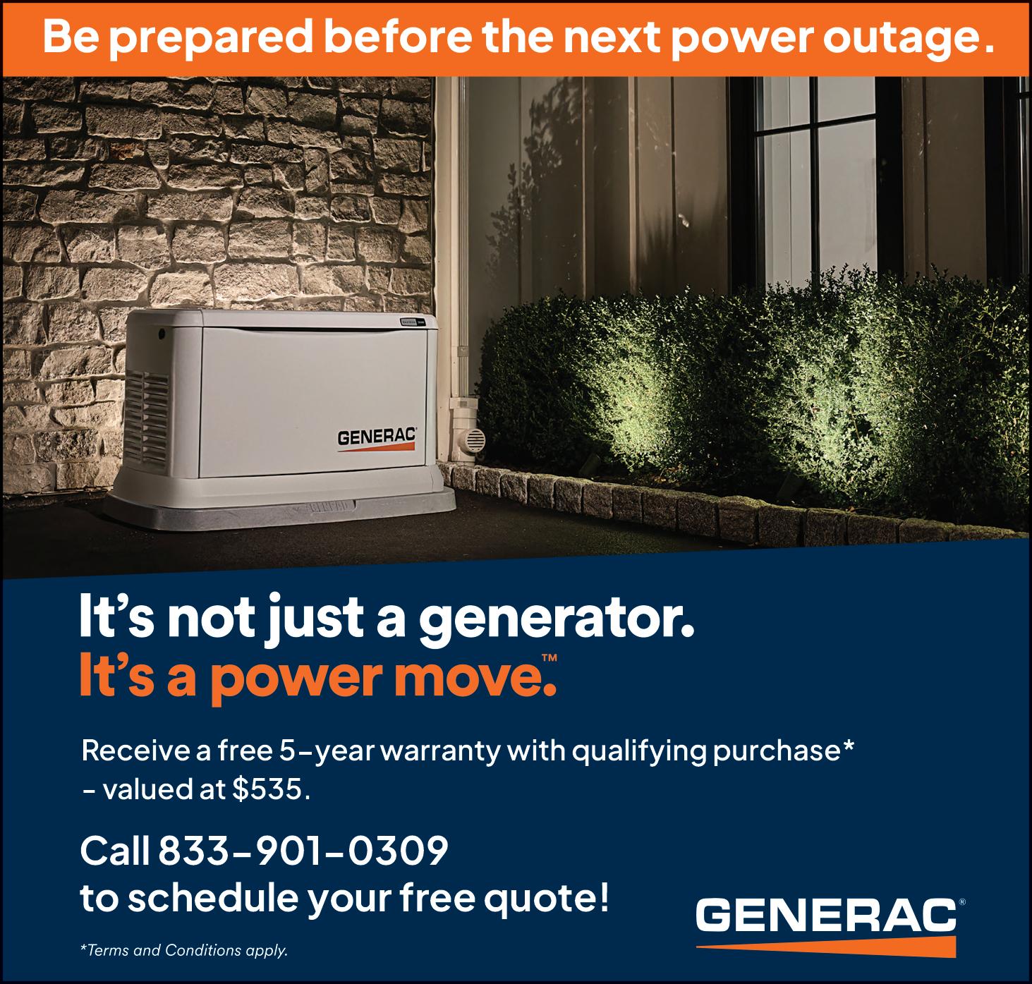 Prepare for power outages today with a Generac Home Standby Generator. Act now to receive a FREE 5-Year warranty with qualifying purchase. Call 1-833-901-0309 today to schedule a free quote. It’s not just a generator. It’s a power move. (t/n)