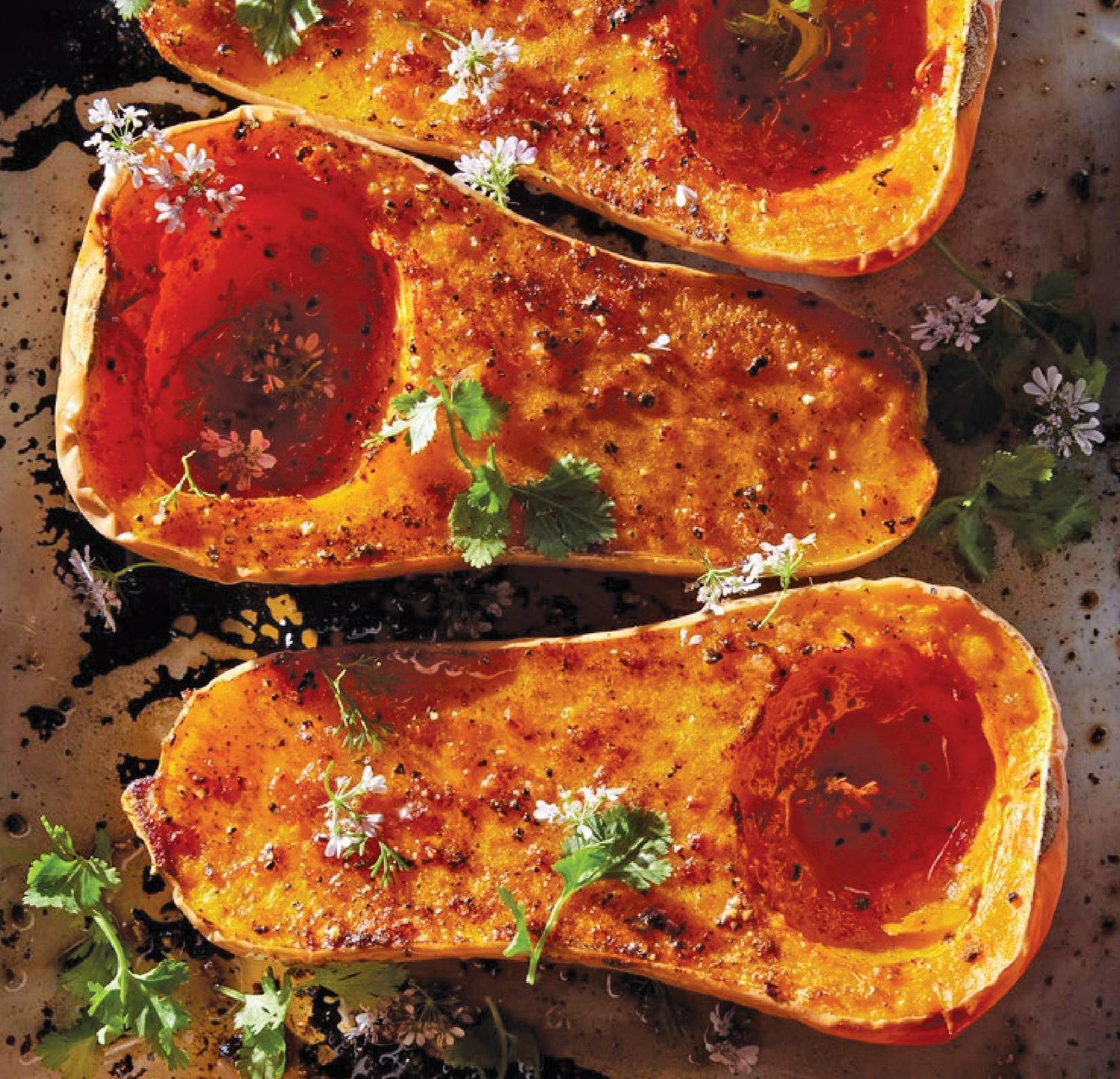 Here, the author shares a recipe that she first tasted in Valle de Guadalupe, Mexico, that she reinterpreted with her own touch. This would make a wonderful side dish surprise for holiday parties. To make this simple recipe, halve and seed the butternut squash, then bake it with melted butter, honey, habanero pepper, cumin, smoked paprika, salt, and pepper. The butternut squash becomes golden brown and caramelized, tasting sweet, savory and spicy all at once.