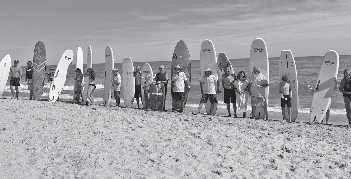 The upbeat energy did have its moments of solemn remembrance shared in solidarity. Surfers and supporters carried white carnations into the surf for a Hawaiian-style paddle-out, forming a floating circle beyond the break.