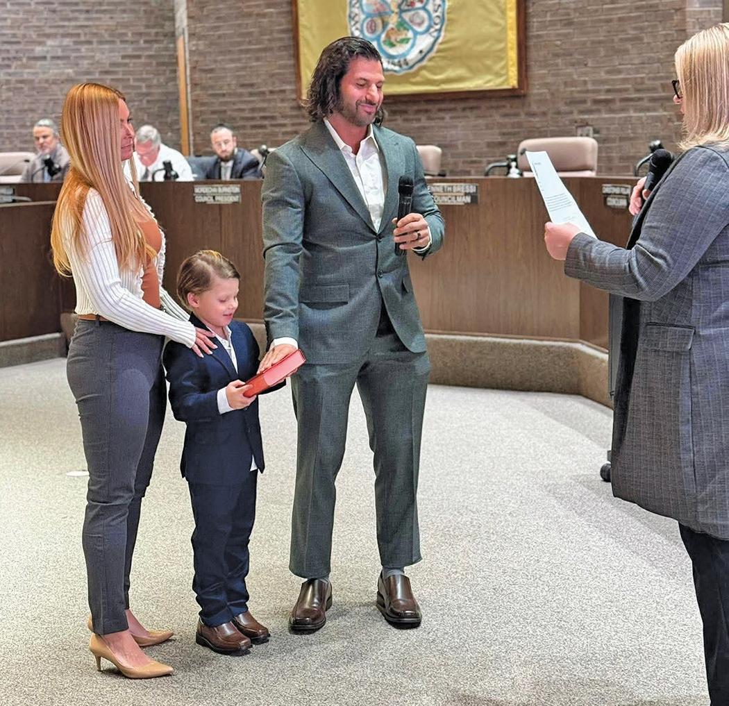 joins his wife and son as Township Clerk Sandra Martin at right, administers the oath of office during a recent Township Council meeting. the addition of Christopher Pollak who was elected last month. Pollak will fill a council spot and he is calling for change in how the