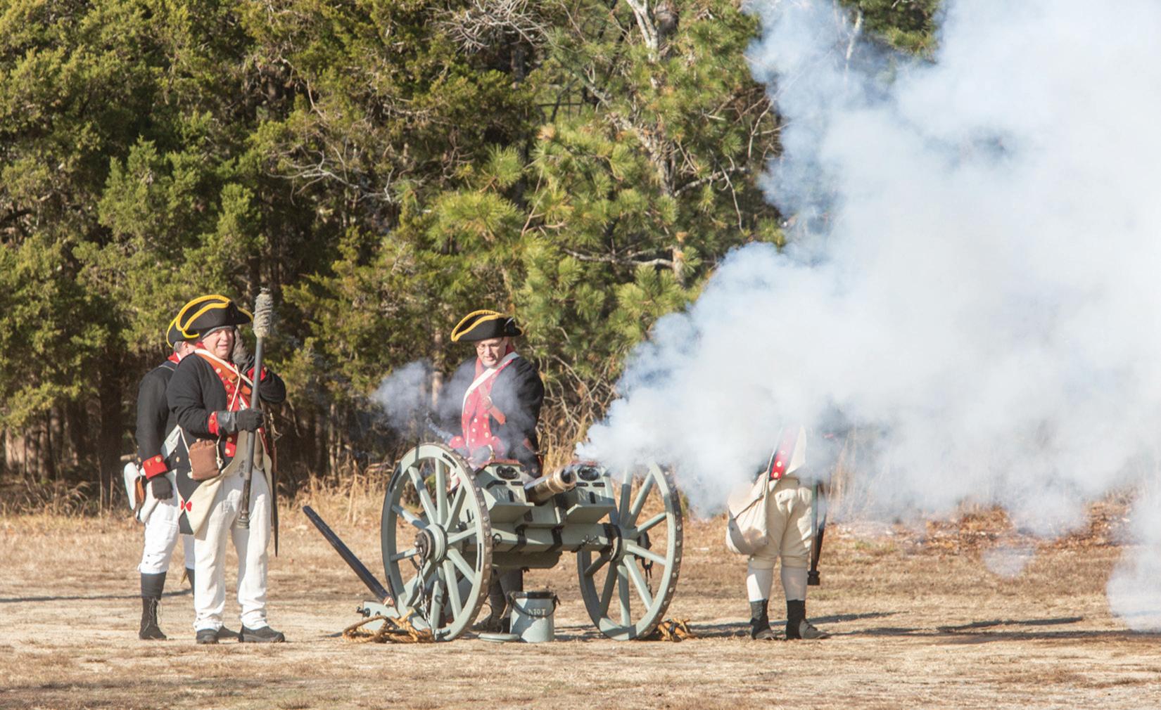 A Battlefield In The Pines Loyalist forces in scarlet coats advanced across the sandy clearing. Patriot militia moved to intercept. Muskets were lifted. Powder ignited in a blinding flash. The skirmish had some clapping their hands over their ears. Others stared wide-eyed as soldiers fell into the straw, portraying the dead and wounded of a late-war clash that unfolded just weeks before peace officially arrived.