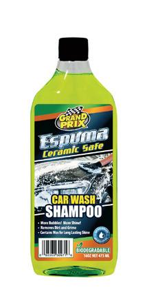 Grand Prix Espuma contiene cera para un brillo más prolongado. Es biodegradable y seguro para los tratamientos de cerámica de tu vehículo. Disponible en 16 y 64 onzas.
