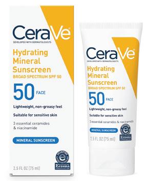 Desarrollado con dermatólogos, CeraVe Hydrating Sunscreen Face Lotion SPF 50 proporciona una protección de amplio espectro con un protector solar 100% mineral.