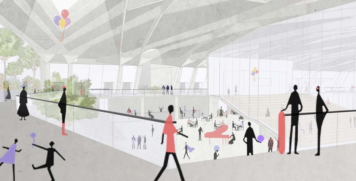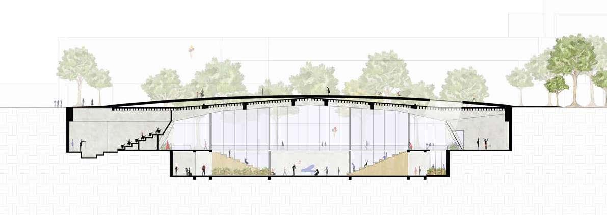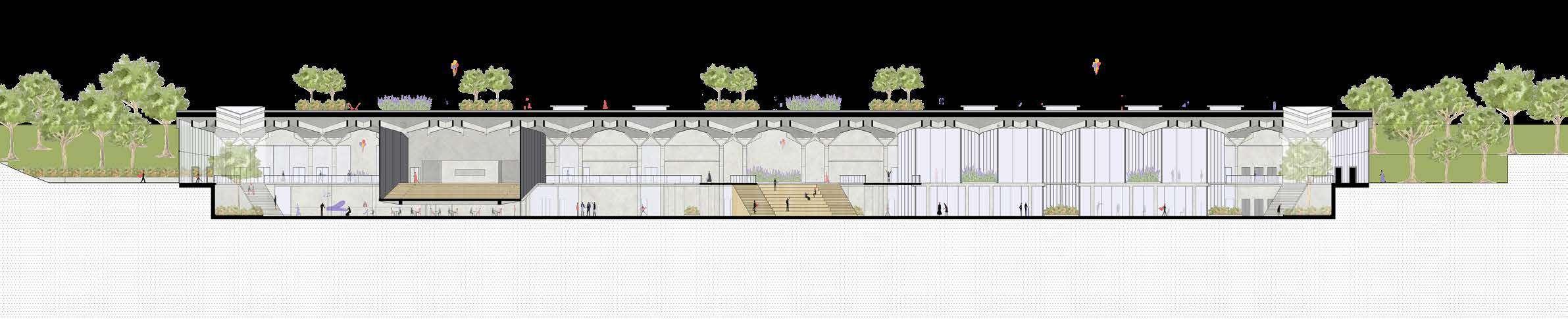 The project is structured by positioning all the activities at both edges sides of the longitudinal axis, thus leaving in the middle the sufficient space capable of evoking that characteristic free space present in the actual building, highlighting it even more by making it in double height having an underground level placing the program at the sides too. The result is a beautiful free space where you can recall the intangible aspect of the building and appreciate yet more the structural system that gave us the interesting geometry that we used to make the distribution of each activity of the different programs.