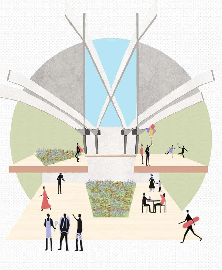 After the comprehension of the building itself and after knowing the critical importance of things such as heritage <understanding this term as something that can be tangible but furthermore something intangible> the objective of the project from the point of view of being an intervention of an existing building was to enhance two things that caught our attention and became our two main interests in this approach; first the incredible structural system that is so unconventional and pioneer for the time that it was designed and built, tangible aspect, and the second one, the feeling of free space that you perceive when you are in the building, thanks also to the structural system, being this without a doubt an intangible aspect that we want to preserve.