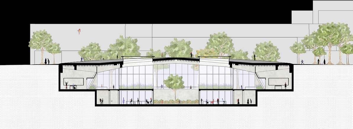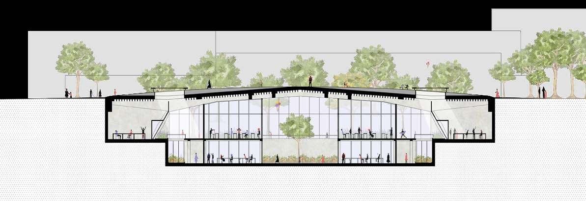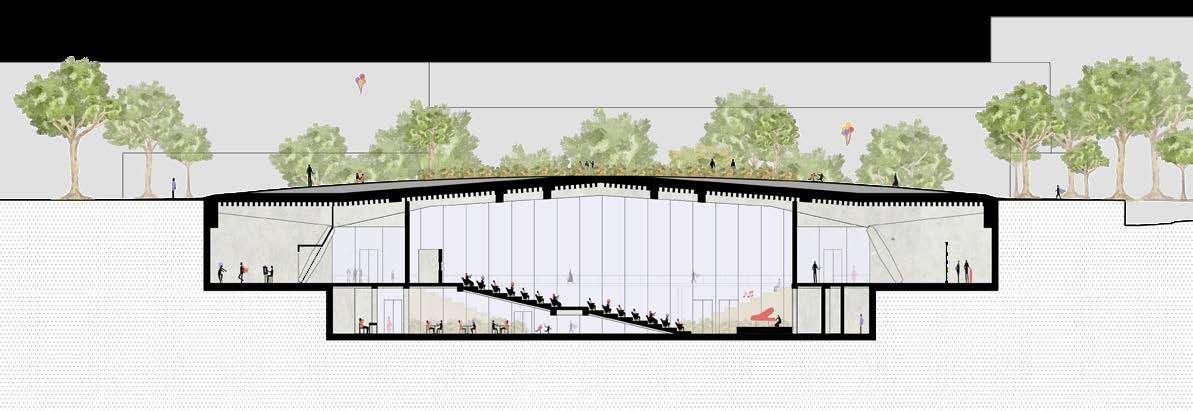 PROGRAM DATA ZONE 1 ZONE 2 Multifunctional rooms Services Cafeteria Vending machine areas Amphitheaters classrooms Vending machine areas Classrooms Printing rooms Type A Type B Services Control access point 1 1 3 4 2 5 2 5 6 6 6 6 7 7 7 8 4 capacity: 85 students (x4) capacity: 48 students (x9) capacity: 38 students (x6) 7 7 7 7 7 7 8 8 8 8 8 9 9 4 4 4 5 5 1 2 3 4 Control access point 5 6 7 8 4 2 4 2 5 9 10 10 Shops 10 (x2) (x2) (x3) (x2) capacity: 24 students (x3) capacity: 100 students (x3) ZONE 1 ZONE 2 Restaurant Services Mensa Auditorium Vending machine area Exposition area Computer laib 1 2 3 4 5 10 1 4 3 6 5 8 7 10 7 8 3 3 3 3 3 3 2 6 5 5 8 7 8 7 8 7 7 12 11 9 9 11 11 12 7 8 8 10 10 7 8 8 7 7 8 8 7 9 9 Shop 7 Individual study rooms 8 Collective study rooms 9 (x66) (x4) Classrooms 11 Control access point 12 (x11) Services 3 Recreational areas Green areas Connections Parco Valentino Dog’s zone Roof finishing Seating areas Green grass cover Skylight materials Glass Concrete seat HISTORY TIMELINE FUNCTION PROPOSAL URBAN ANALYSIS 1 1878 Start of the concession to Società Ippica Torinese Construction of Palazzo della Moda Construction of Torino Esposizioni Morandi presents the project Start of construction of the building Grand opening of the lake in Parco del Valentino 1937 1938 by Nervi and Sottsass 1948 1958 by Nervi and Biscaretti 1959 six month period 1st Salone dell’ Automobile 1959 Transformation into a parking lot 1994 Rarely used 2019 Concession to GTT EDUCATIONAL CULTURAL GREEN AREAS STUDENTS POSSIBLE USERS GENERAL PUBLIC EDUCACIONAL Vending machine areas Classrooms Printing rooms Restaurant Mensa Auditorium Exposition area Computer laib Individual study rooms Collective study rooms Services CULTURAL PROGRAM ZONE 1 ZONE 2 Multifunctional rooms Services Cafeteria Vending machine areas DAILY ACTIVITY TIMELINE 00 01 02 03 04 05 06 07 08 09 10 11 12 13 14 15 16 17 18 19 20 21 22 23