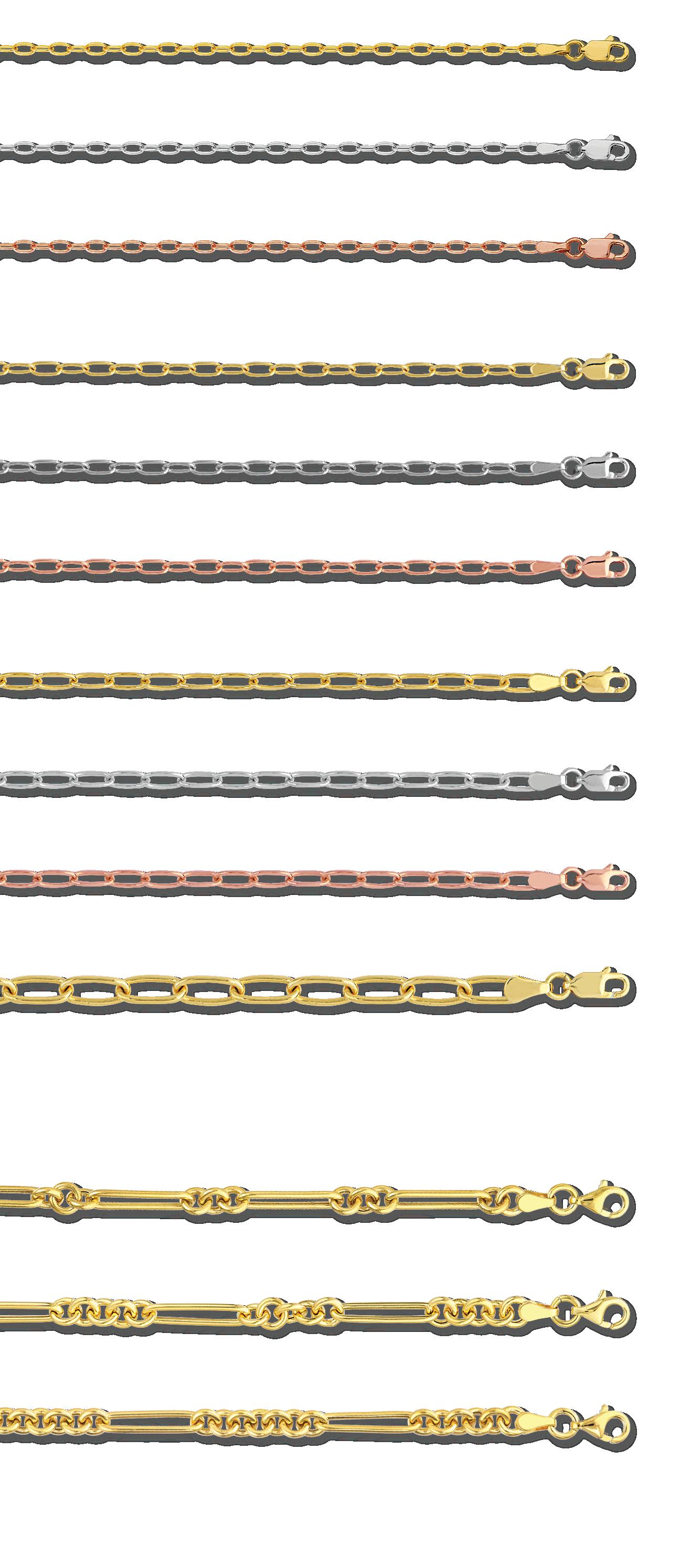 www .midaschain. com 25 14 KARAT Chain MZ005413-14Y MZ001036-14Y MZ001035-14Y MZ001046-14Y MZ001043-14Y MZ001039-14Y Gram Weight Gram Weight Gram Weight Gram Weight Gram Weight Gram Weight Unit Price Unit Price Unit Price Unit Price Unit Price Unit Price 22.30 15.88 11.15 8.05 4.26 1.23 1.11 24.75 17.61 12.35 8.89 4.70 1.35 27.25 19.54 13.55 9.75 5.13 1.50 29.70 21.06 14.75 10.62 5.57 37.15 26.24 18.35 13.21 $3,961 $2,830 $1,980 $759 $221 $199 $4,396 3,128 $2,190 $1,583 $837 $242 $4,840 $3,435 2,407 $1,736 $913 $269 $5,275 $3,741 2,636 $1,891 $1,004 $992 $6,598 4,661 $3,259 $2,352 MZ001039-14B Gram Weight Unit Price 1.23 1.11 1.35 1.50 $223 $202 $245 $272 MZ001043-14B Gram Weight Unit Price 4.26 4.70 5.13 5.57 $768 $847 $925 MZ001046-14B Gram Weight Unit Price 8.02 8.89 9.75 10.62 13.21 $1,602 $1,446 $1,433 $1,757 $1,914 $2,381 MZ001035-14B Gram Weight Unit Price 11.15 12.35 13.55 14.75 18.35 $2,005 $2,436 $2,220 $2,652 $3,299 MZ001036-14B Gram Weight Unit Price 15.88 17.61 19.54 21.06 26.24 $2,855 3,166 $3,477 $3,787 4,718 MZ005413-14B Gram Weight Unit Price 22.30 24.75 27.25 29.70 37.15 $4,010 $4,450 $4,900 $5,340 $6,680 TM022784-14Y Gram Weight Unit Price 3.04 3.38 3.72 $580 $645 $710 TM022784-14K Gram Weight Unit Price 3.04 3.38 3.72 $580 $645 $710 7.5” TM022685-14Y Gram Weight Unit Price 18.19 7.02 $3,485 $1,345 TM022784-14B Gram Weight Unit Price 3.04 3.38 3.72 $588 $654 $720 030 Gauge 120 Gauge 050 Gauge 050 Gauge 050 Gauge 030 Gauge 080 Gauge 100 Gauge 120 Gauge 120 Gauge 140 Gauge 140 Gauge 100 Gauge 080 Gauge 060 Gauge 060 Gauge White Gold White Gold White Gold White Gold White Gold White Gold 1.10 mm 1.10 mm 3.00 mm 3.70 mm 4.40 mm 4.40 mm 5.60 mm 5.60 mm 3.70 mm 3.00 mm 2.30 mm 2.30 mm Please indicate length when ordering White Gold Rose Gold 2.20 mm 2.20 mm 2.20 mm 5.40 mm MODERN MARINER CHAIN STYLE # 16” 18” 20” 22” 30” 24”