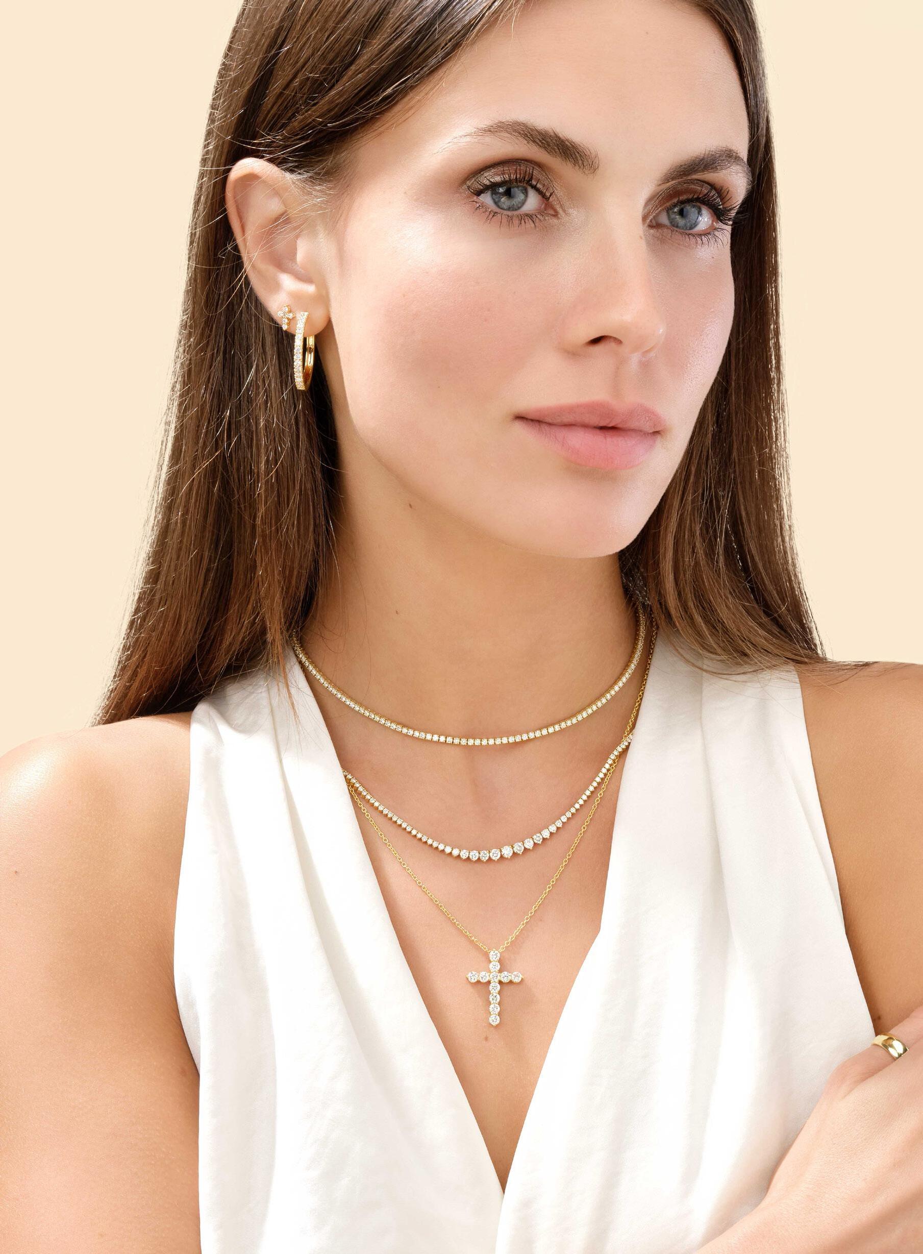 A. Diamond Cross Earrings (1/4tcw) TM027610-14Y $1,488 | Diamond Hoop Earrings (7/8tcw) TM025079-14Y $4,835 | Diamond 18” Tennis Necklace (6-1/3tcw) TM026161-14Y_18 $22,911 | Diamond Graduated Half Tennis Necklace (3-1/4tcw) TM025142-14Y_17 $15,751 | 1.05mm Open Cable Chain MZ005843-14Y_20 $529 | Diamond Cross Pendant (1-5/8tcw) TM026157-14Y $7,452 | Wide Round Band TM025135-14Y_7 $1,208